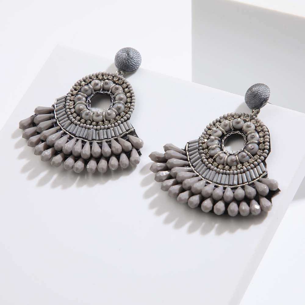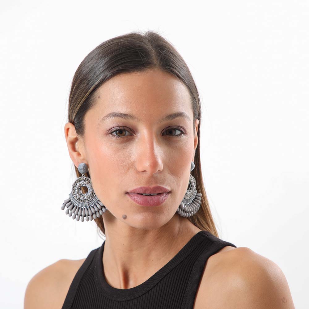 Aros Humana Aromo largo gris que pertenecen a la colección Radiant Red. Aros con diferentes mostacillas en color gris.