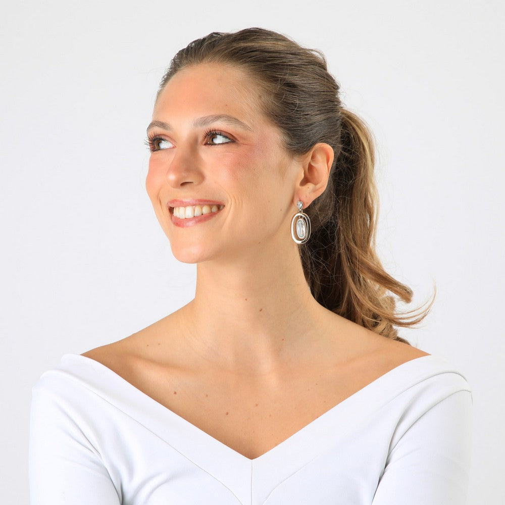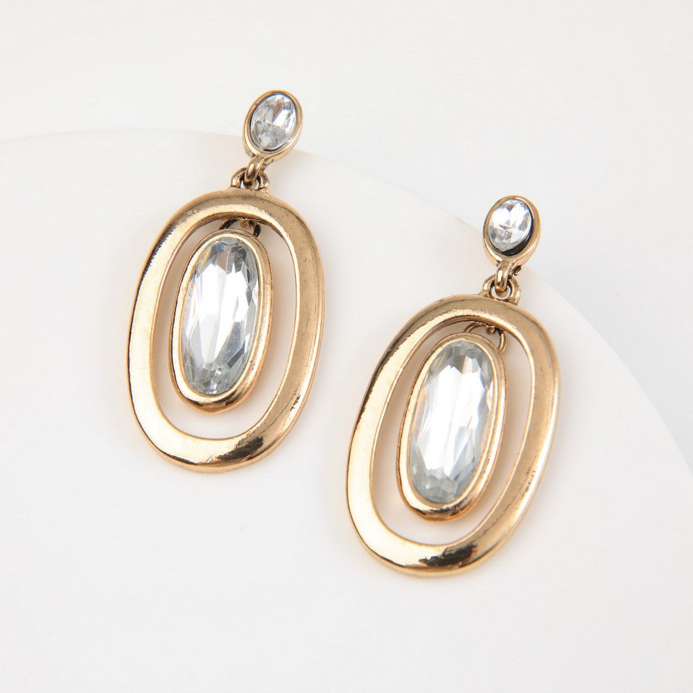 Aros en tono dorado con diseño ovalado doble y un colgante central alargado tipo cristal en un tono transparente que aporta un brillo elegante. La parte superior incluye un pequeño detalle brillante que complementa la caída del diseño. Son livianos, modernos y perfectos para levantar looks invernales con un toque luminoso y sofisticado, ideales para abrigos oscuros o tonos neutros.