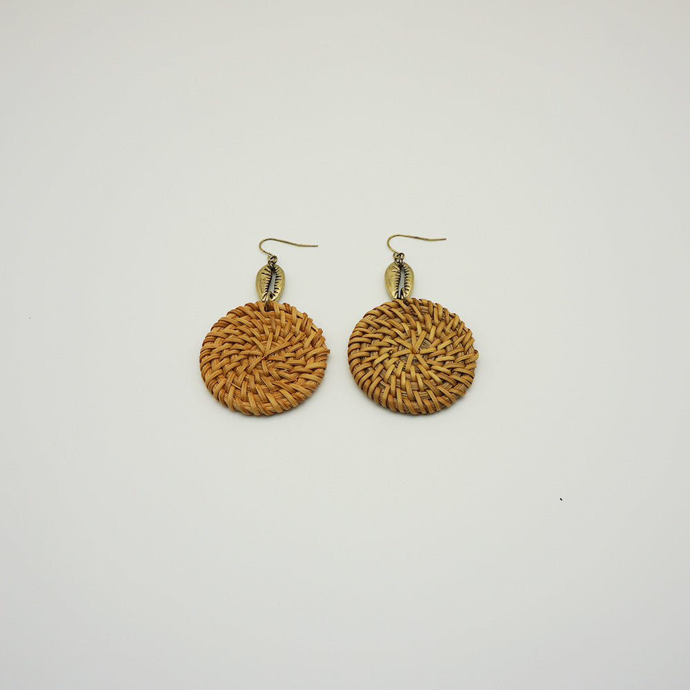 Aros Tatienne Chile Largos de color café que pertenecen a la colección Modern Craft. Compuesto por circulos envueltos en Raffia.
