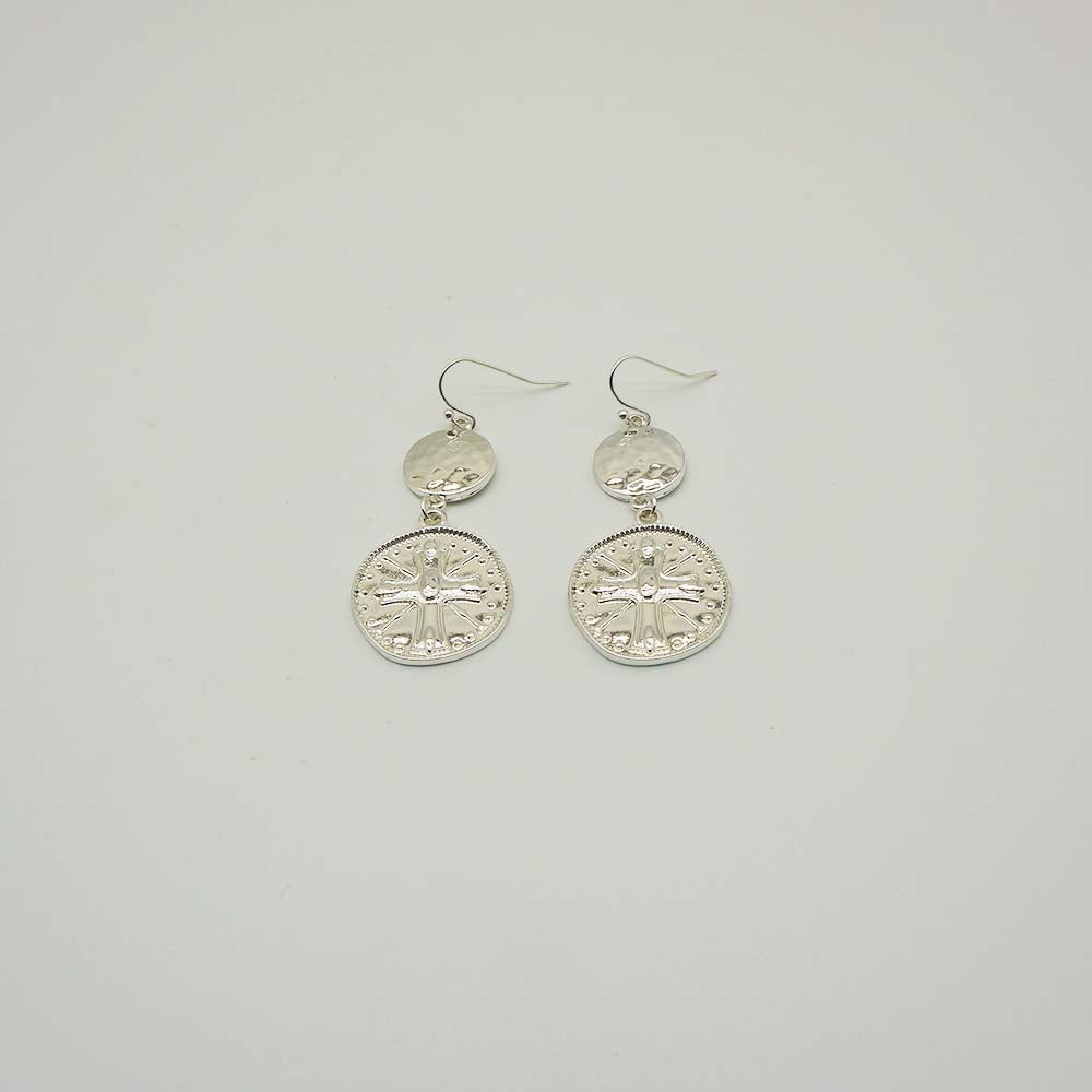 Aros Tatienne Cruces Largos Plateados. Compuesto por dos monedas hacia abajo con un estampado de una cruz en la más grande