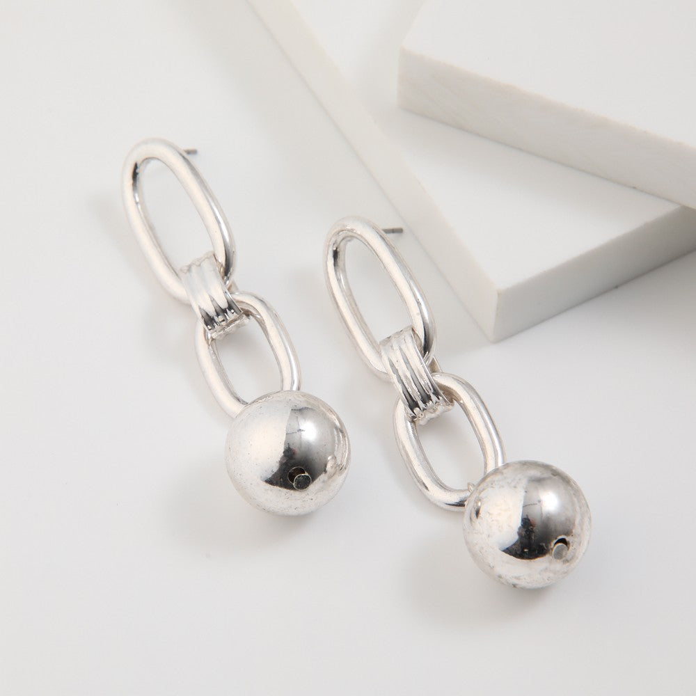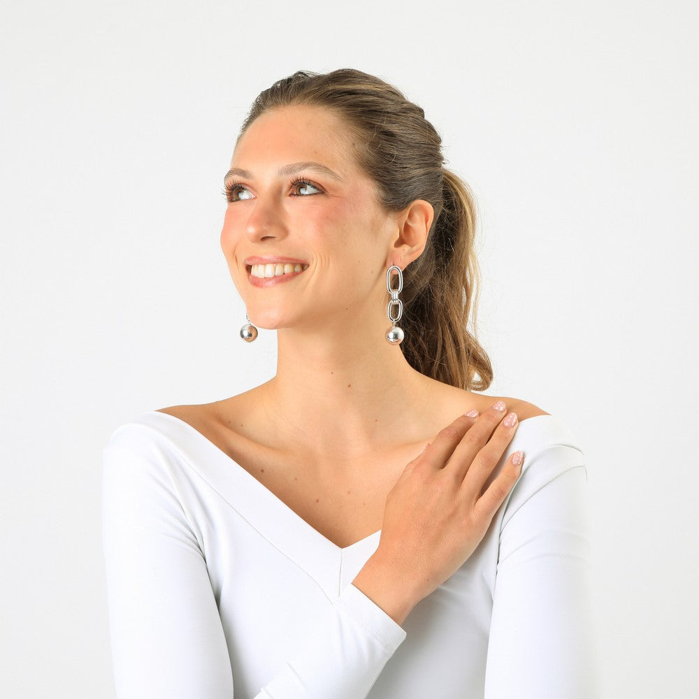 Aros de diseño moderno con eslabones metálicos en acabado plateado y colgante esférico. Presentan una composición de formas ovaladas que aporta movimiento y brillo, logrando un equilibrio entre estilo contemporáneo y elegancia. Un accesorio versátil, ideal para elevar looks diarios o complementar tenidas más sofisticadas.