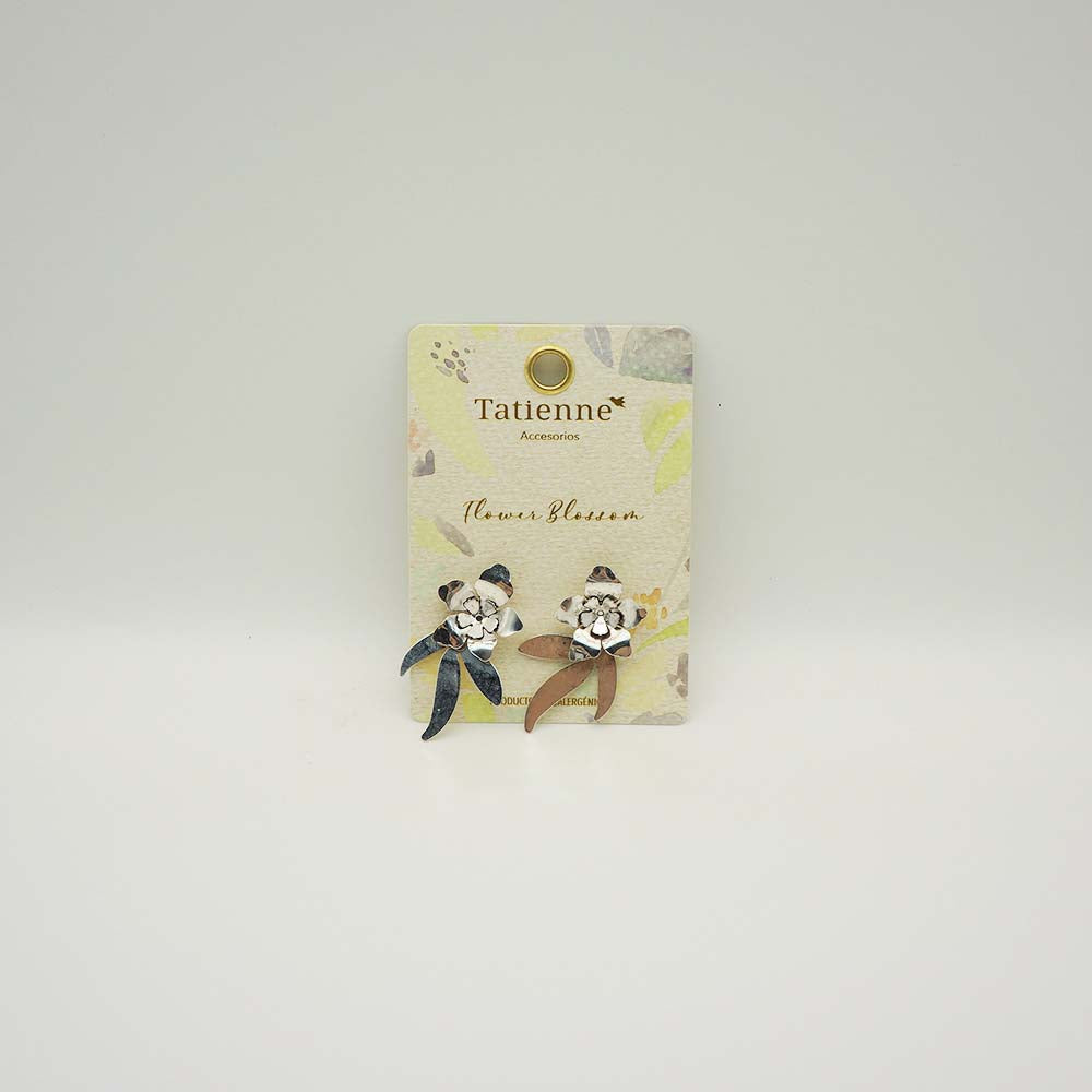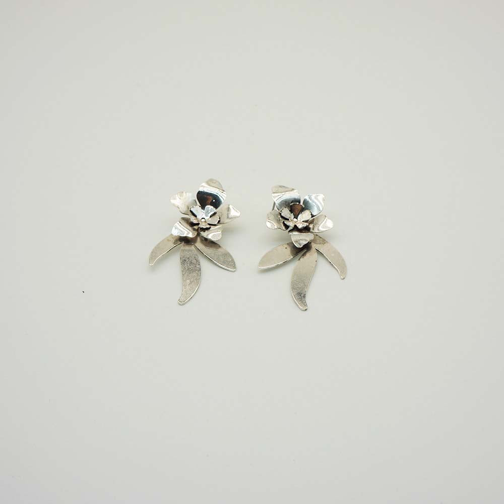 Aros Tatienne Flower Power Largos Plateados. Compuesto por una flor con tres hojas que caen de ella