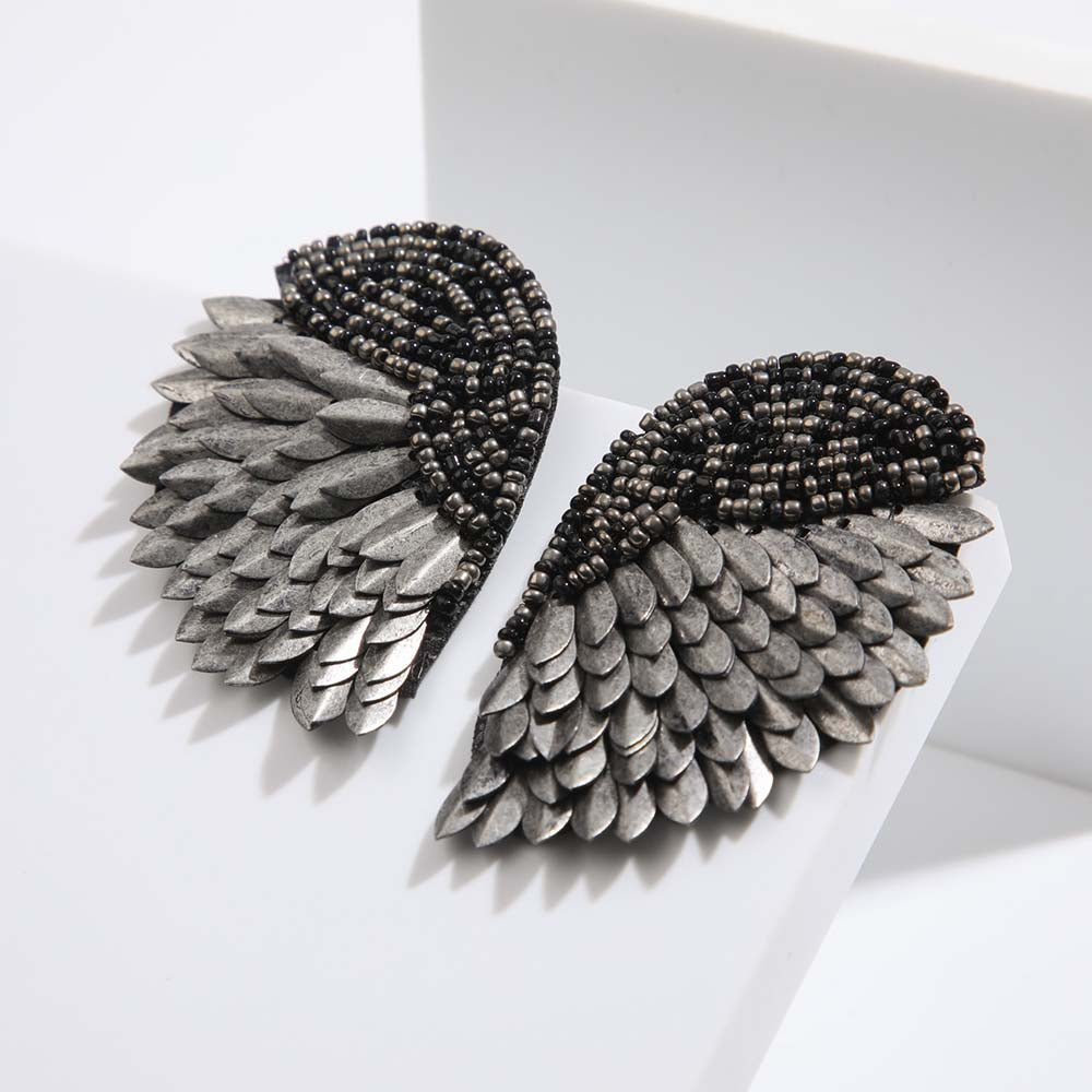Aros Humana Laborno plateados que pertenecen a la colección Radiant Red. Aros en forma de alas combinados con piezas plateadas y mostacillas.