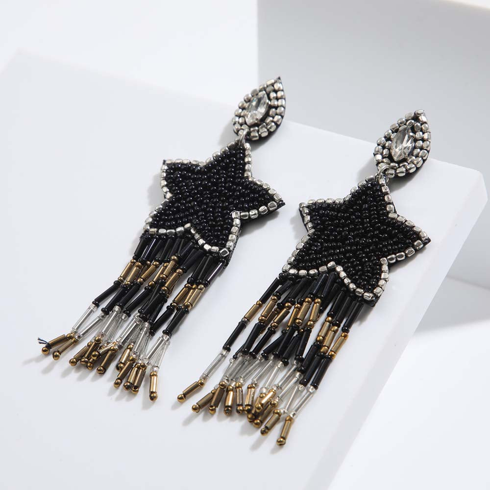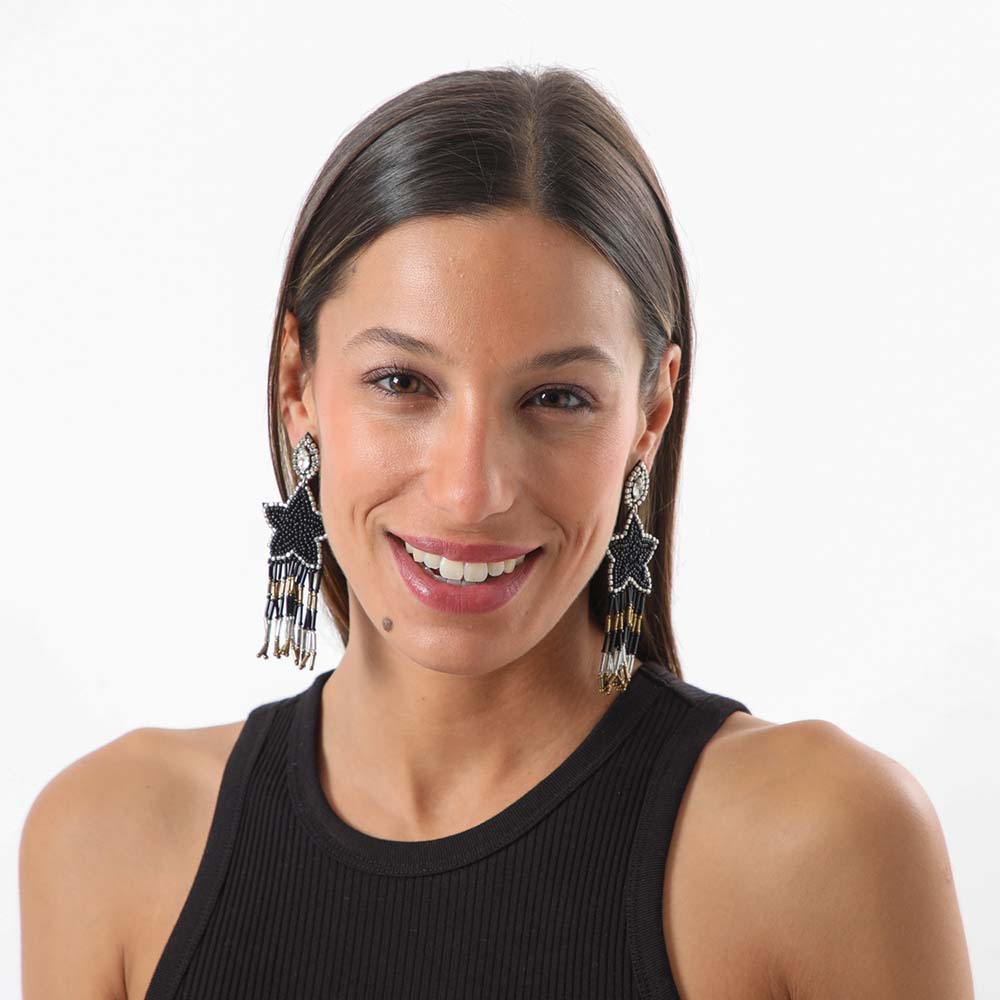 Aros Humana León largos negros que pertenecen a la colección Planteary Alignment. Aros con forma de estrellas combinado con mostacillas en color negro, dorado y plateado.