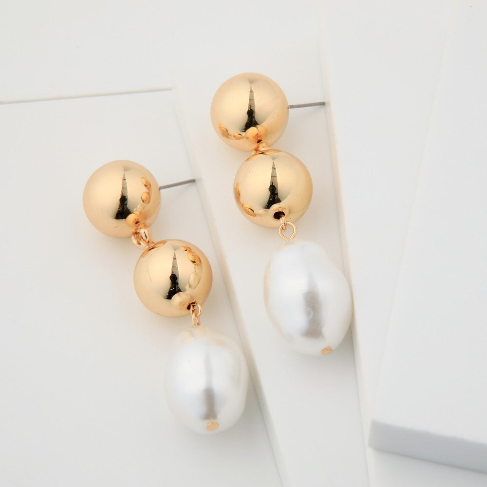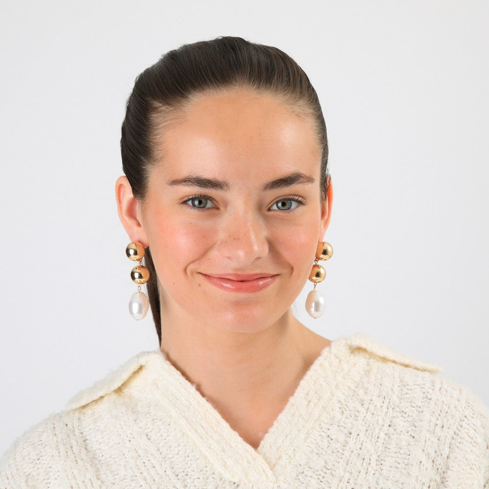 Aros colgantes dorados, con dos esferas lisas y brillantes que terminan en una gota tipo perla blanca. Un diseño elegante y moderno para ocasiones especiales.