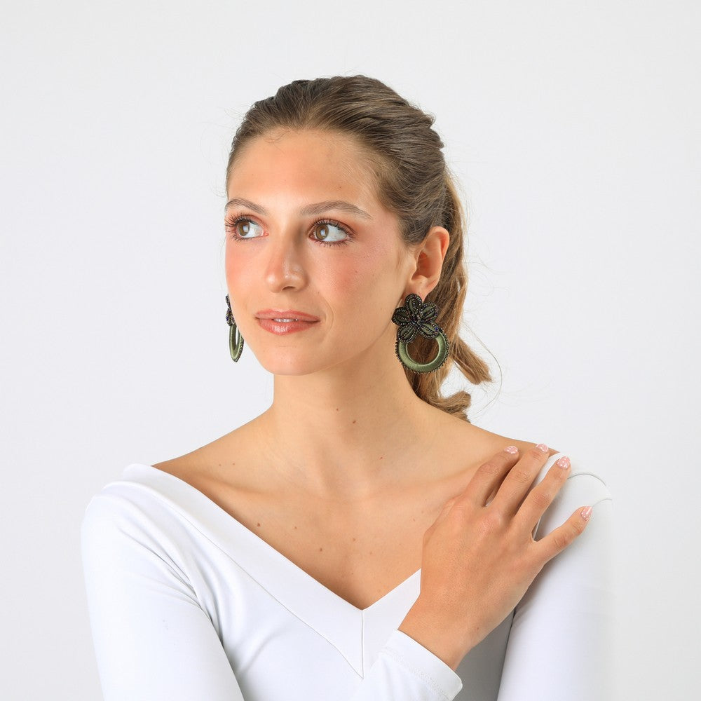 Aros colgantes con diseño floral, elaborados con bordado en mostacillas que aporta textura y un acabado artesanal. La composición combina una flor superior con un aro inferior bordado, creando una silueta equilibrada y liviana. Su diseño llamativo pero armónico los hace ideales para complementar looks casuales o más arreglados, sumando un toque decorativo sin perder funcionalidad. Un accesorio práctico y fácil de combinar.