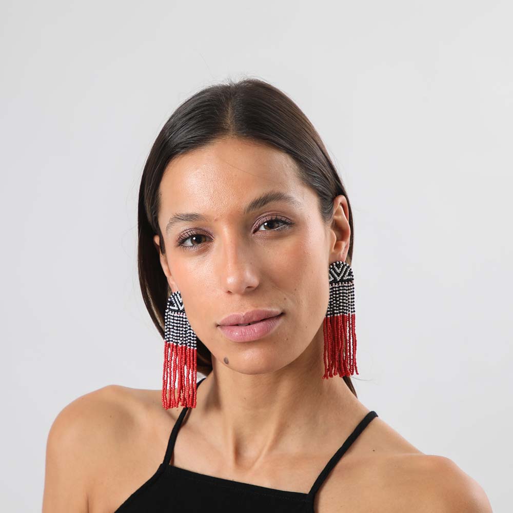 Aros Tatienne largos rojos. Aros combinados con mostacillas en color negro, blanco y rojo.