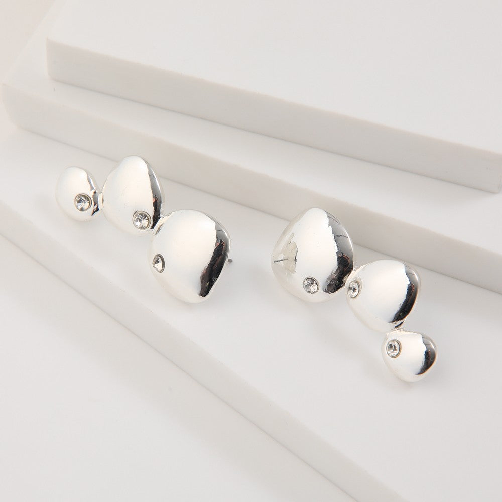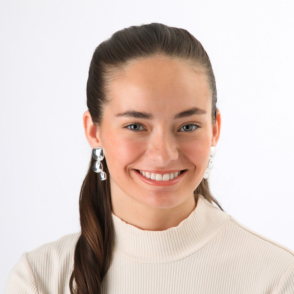 Aros largos en plateado, formados por piezas redondeadas de acabado liso con pequeños brillos transparentes incrustados. Un diseño moderno y delicado que acompaña la línea de la oreja.