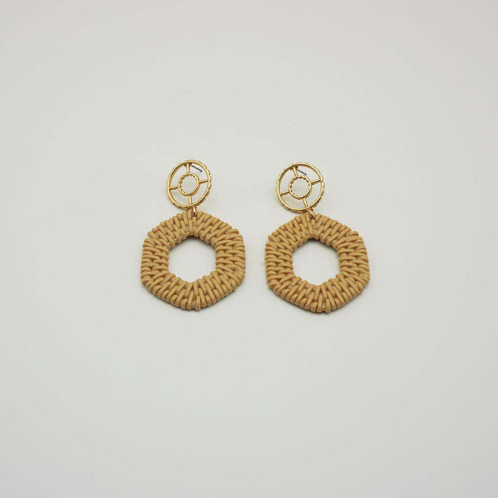 Aros Tatienne Mira largos Beige. Compuestos por una base metálica dorada con forma de circulo, con otro cirulo al centro y conectados por cuatro puntos. De esta base se desprende un hexagono de rafia beige.
