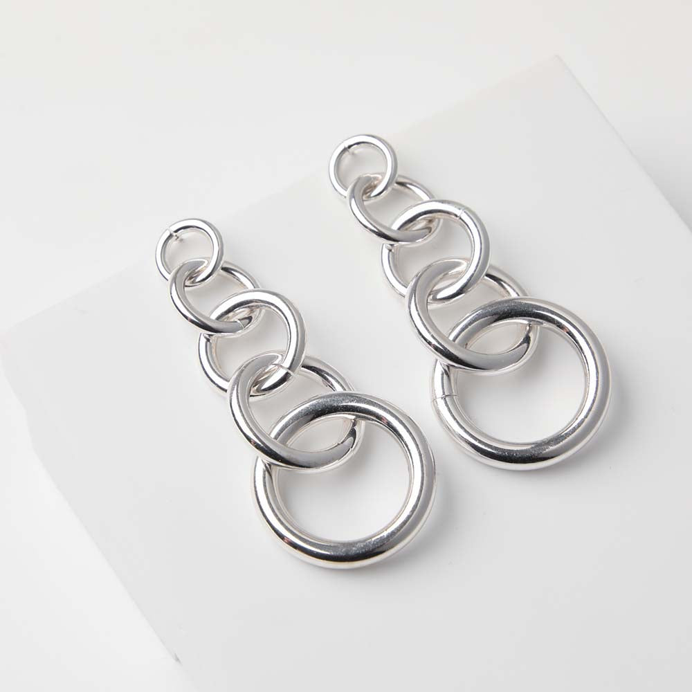 Aros Humana Argollas Largos de color plateado que pertenecen a la colección Essential. Es una fila de cinco argollas que van aumentando su tamaño de arriba hacia abajo. Vienen muy bien presentados dentro de una caja.
