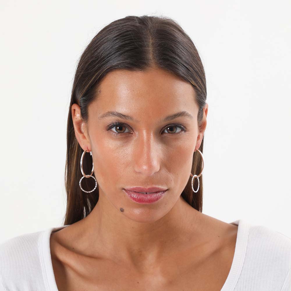 Aros Humana Loop Largos de color plateado que pertenecen a la colección Essential. En la parte superior tiene una argolla grande y lisa de la cual cuelga otra argolla más pequeña con textura. Vienen muy bien presentados dentro de una caja.