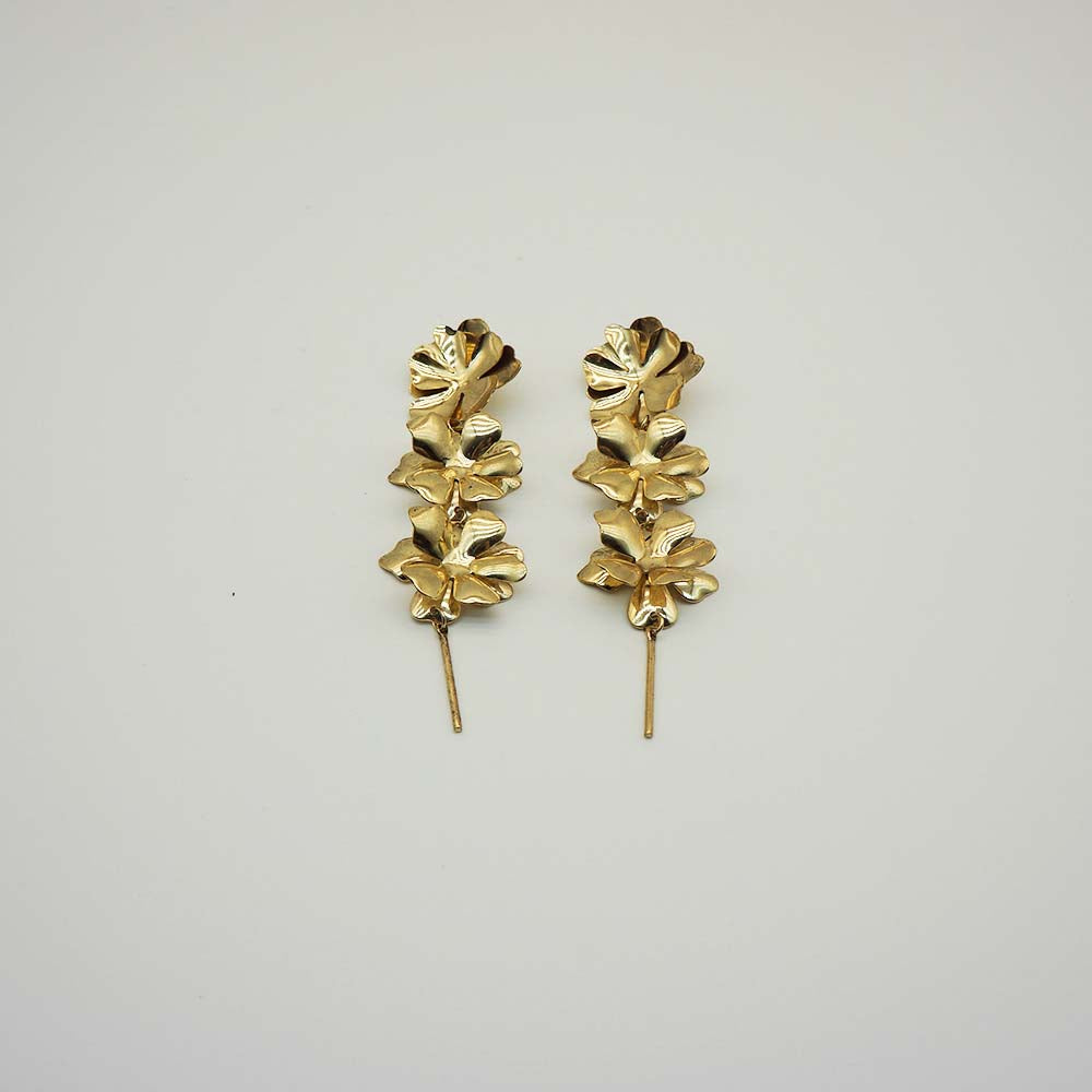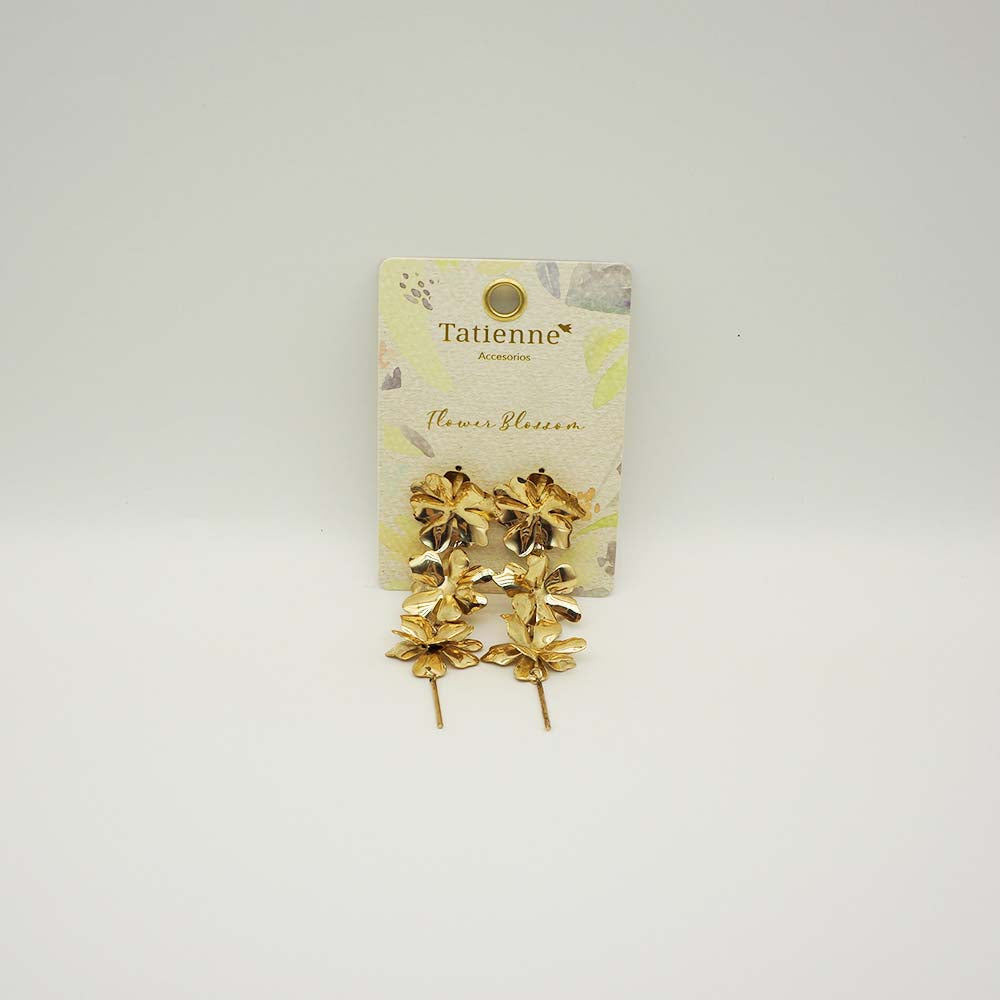 Aros Tatienne Primavera Largos Dorados. Compuesto por 3 flores que cuelgan hacia abajo con dos sets de petalos