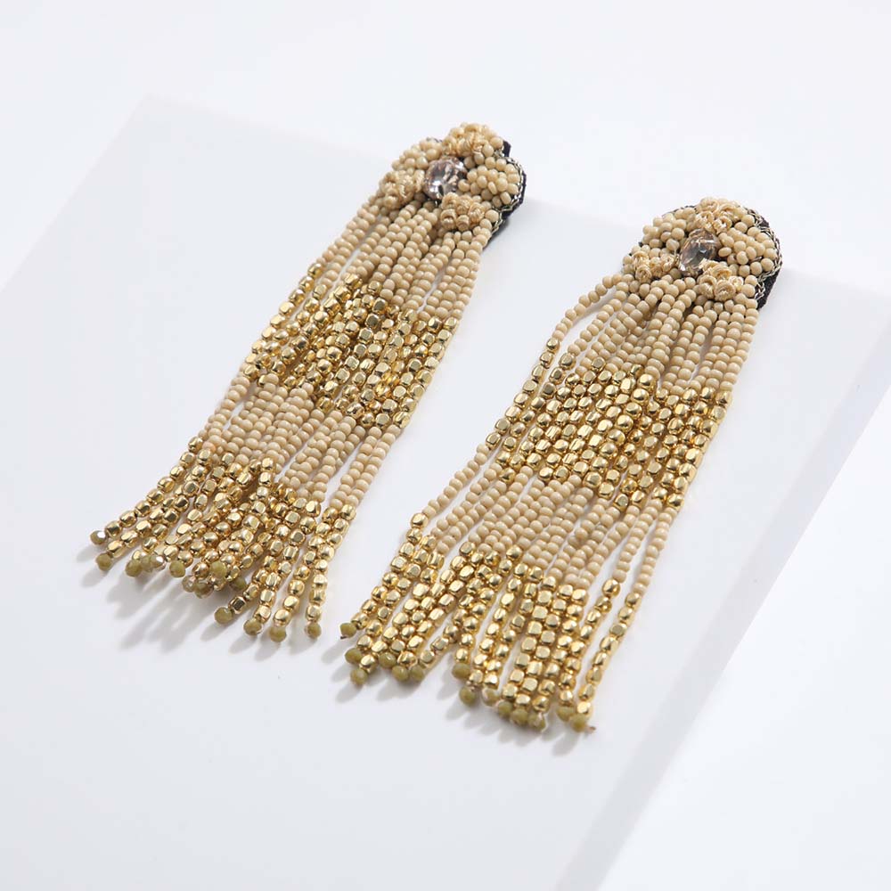 Aros Humana Reus largos beige que pertenecen a la colección Nephrite Green. Aros de mostacillas combinados en color beige y dorado.