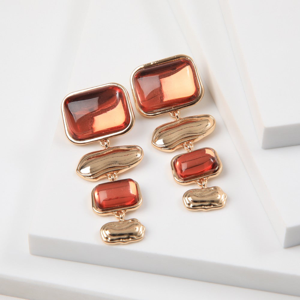 Aros largos, con diseño moderno y elegante. Presentan una composición de piezas metálicas en tono dorado con acabado brillante, combinadas con aplicaciones rectangulares en color ámbar de efecto translúcido. El formato colgante en secciones aporta movimiento y presencia, convirtiéndolos en un accesorio protagonista. Un diseño moderno y funcional, ideal para elevar looks de noche o complementar tenidas más simples con un toque sofisticado.