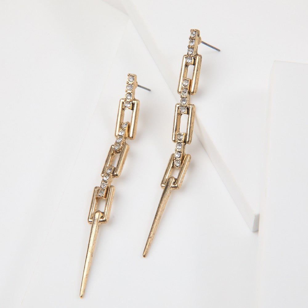 Aros alargados con estructura articulada en acabado dorado con eslabones rectangulares combinados con aplicaciones tipo cristal, que aportan brillo sutil. Un diseño moderno y funcional, ideal para elevar looks de día o noche.