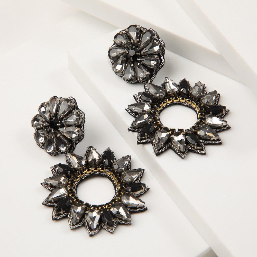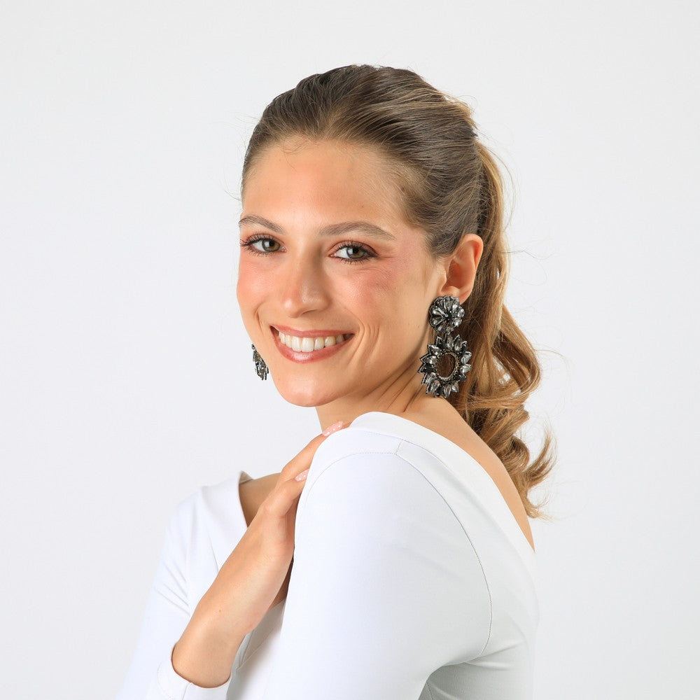 Aros colgantes con estructura circular y diseño ornamental, compuestos por múltiples piezas facetadas que generan brillo y relieve. Módulo superior compacto y un aro inferior calado, unidos de forma articulada para aportar movimiento al uso. Su construcción destaca por el trabajo en capas y el detalle decorativo, logrando un diseño protagonista pero equilibrado. Un accesorio ideal para elevar looks de noche o tenidas más especiales, manteniendo un estilo moderno y funcional.