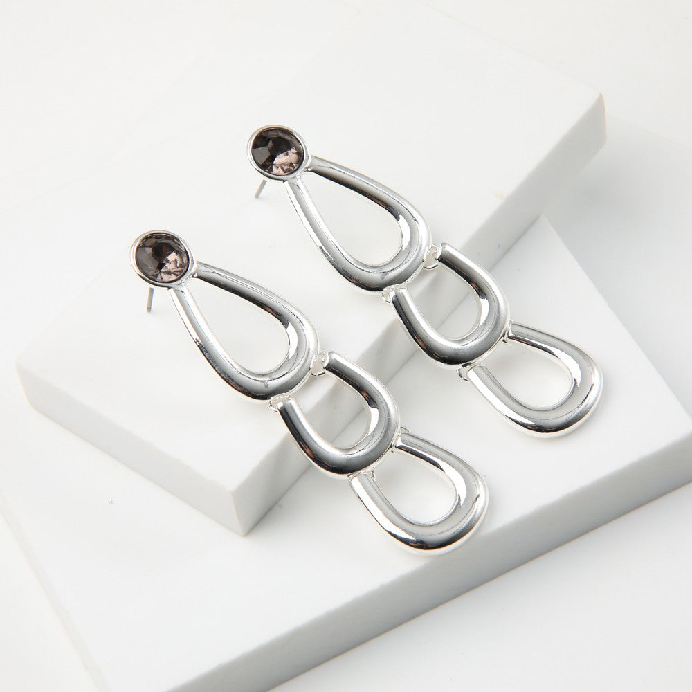 Aros colgantes en tono plateado, con detalle superior de tipo cristal en tono gris y diseño compuesto por eslabones ovalados de acabado brillante. Presentan una silueta alargada que aporta movimiento y un estilo moderno.Un accesorio llamativo y fácil de combinar, ideal para looks de día o de noche.