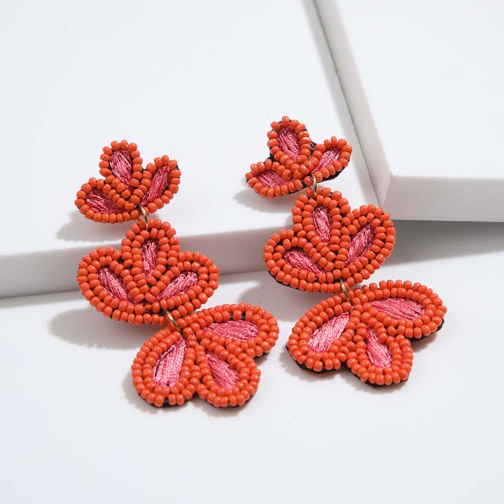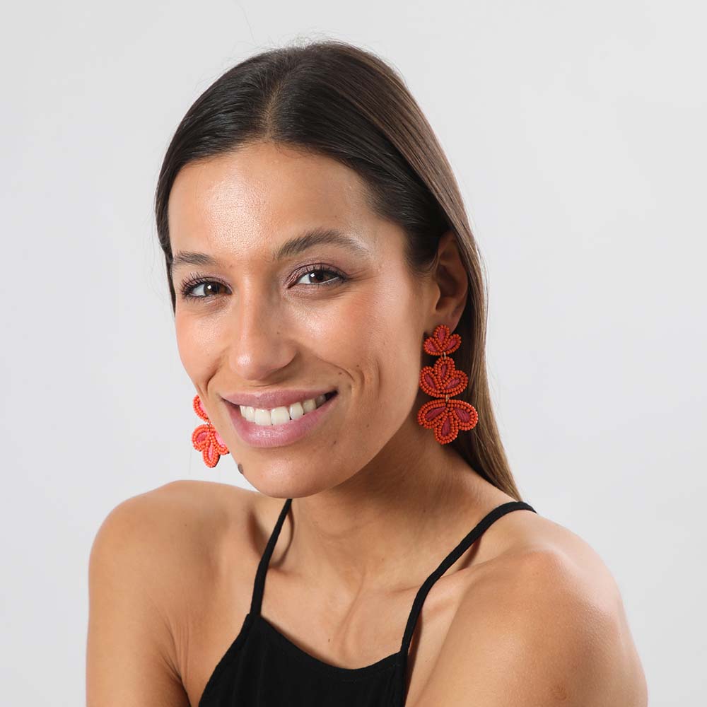 Aros Tatienne Teide largos naranjo. Aros bordados con mostacillas en color naranjo y rosado.