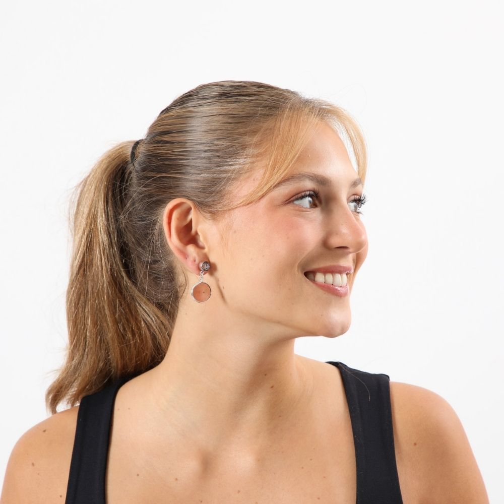 Aros colgantes medianos de brillantes de fantasía morados y rosados.