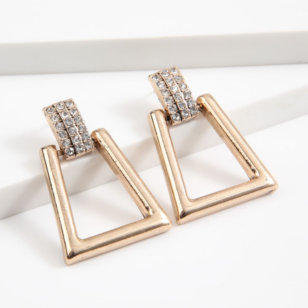 Aros medianos dorado de brillantes de fantasía con dije cuadrado.
