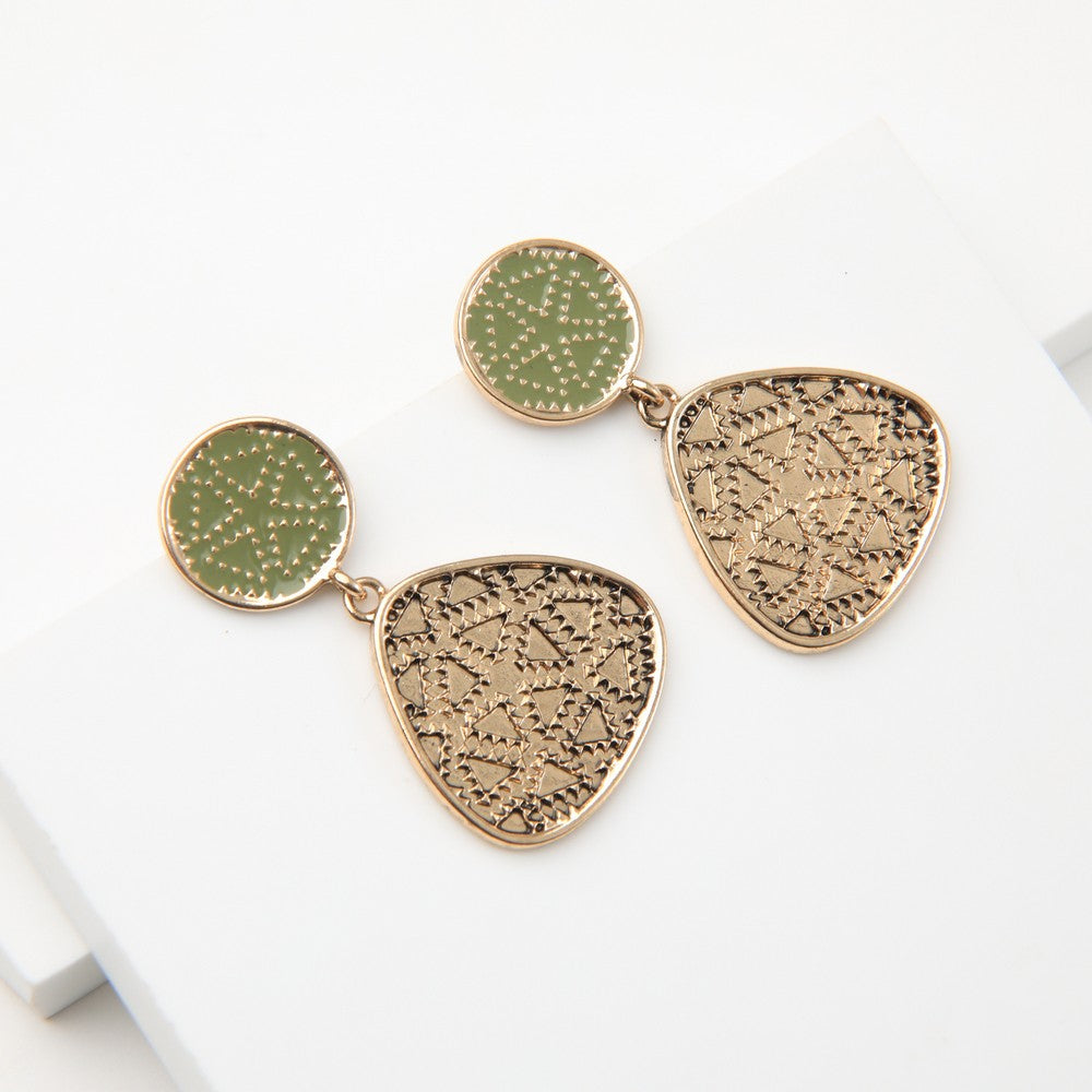 Aros colgantes de diseño compuesto por pieza superior circular de color verde y superficie texturada. Presentan colgante inferior en forma triangular de tono dorado con diseño calado geométrico y acabado brillante. Cierre de poste. Ideales para un look elegante.