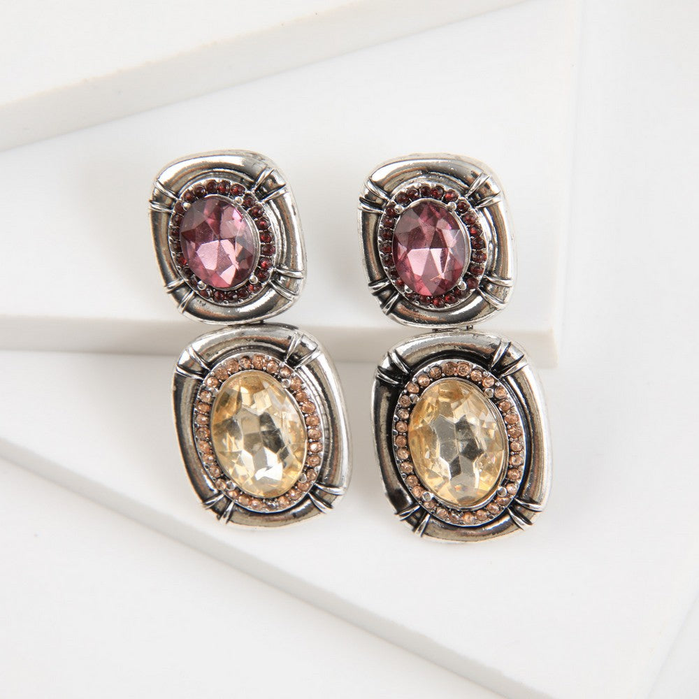 Aros de estructura metálica plateada con relieve, de forma cuadrada suavemente curvada y centro ovalado tipo cristal en dos variantes de color: rosado profundo y ámbar claro. Cada pieza está rodeada por un borde de pequeñas aplicaciones brillantes que aportan luz y textura. Un diseño llamativo pero combinable, ideal para dar un toque elegante y distinto a looks de día o noche.