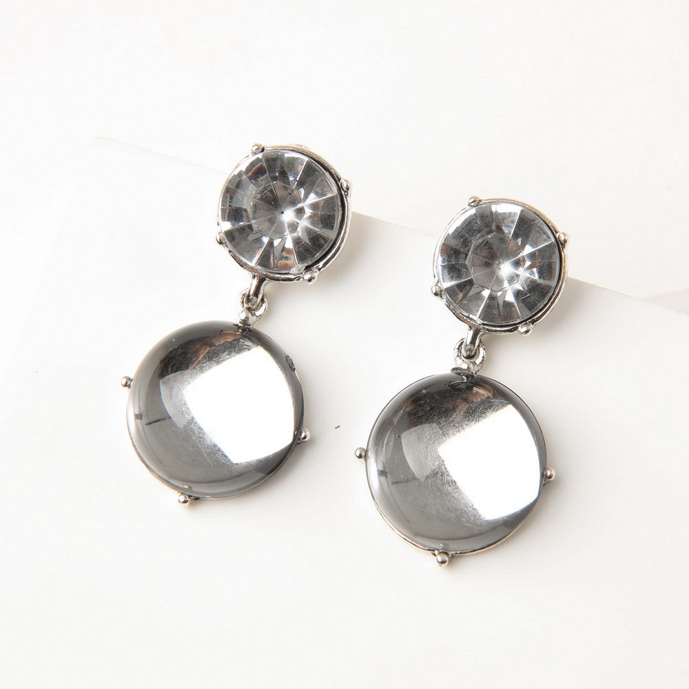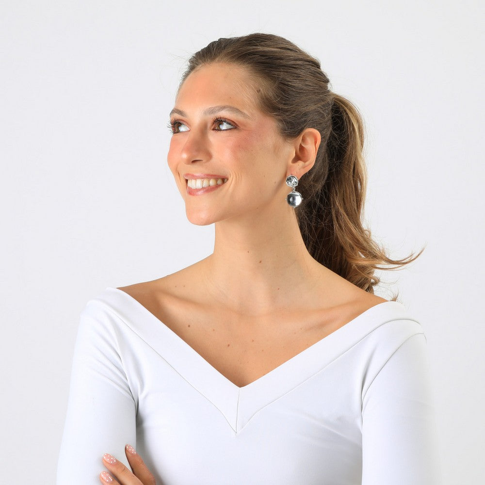 Aros colgantes con doble pieza con tipo cristal en la parte superior, transparente de forma redonda, mientras que la pieza inferior incorpora una piedra transparente que da un acabado plateado espejo, que aporta brillo y volumen. Su diseño combina textura y reflejo, logrando un equilibrio entre elegancia y carácter. Ideales para looks de noche o para elevar un outfit más simple, son un accesorio protagonista y fácil de combinar.