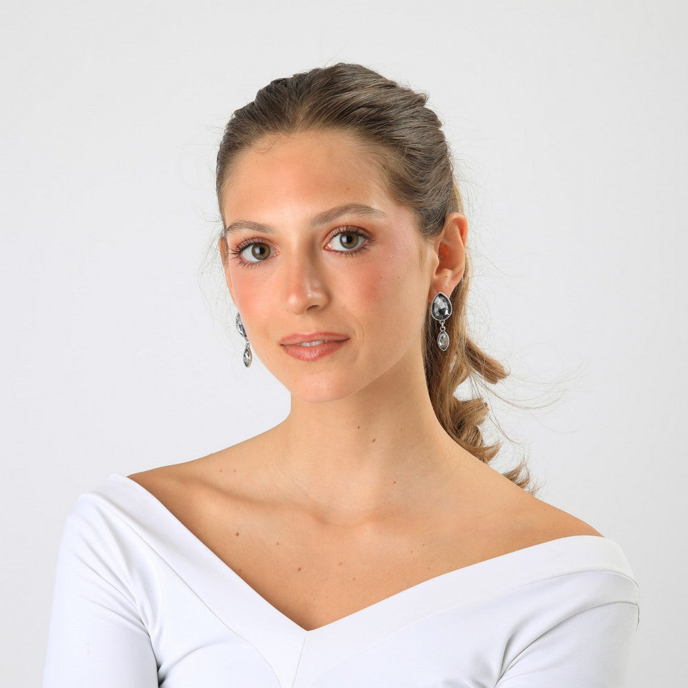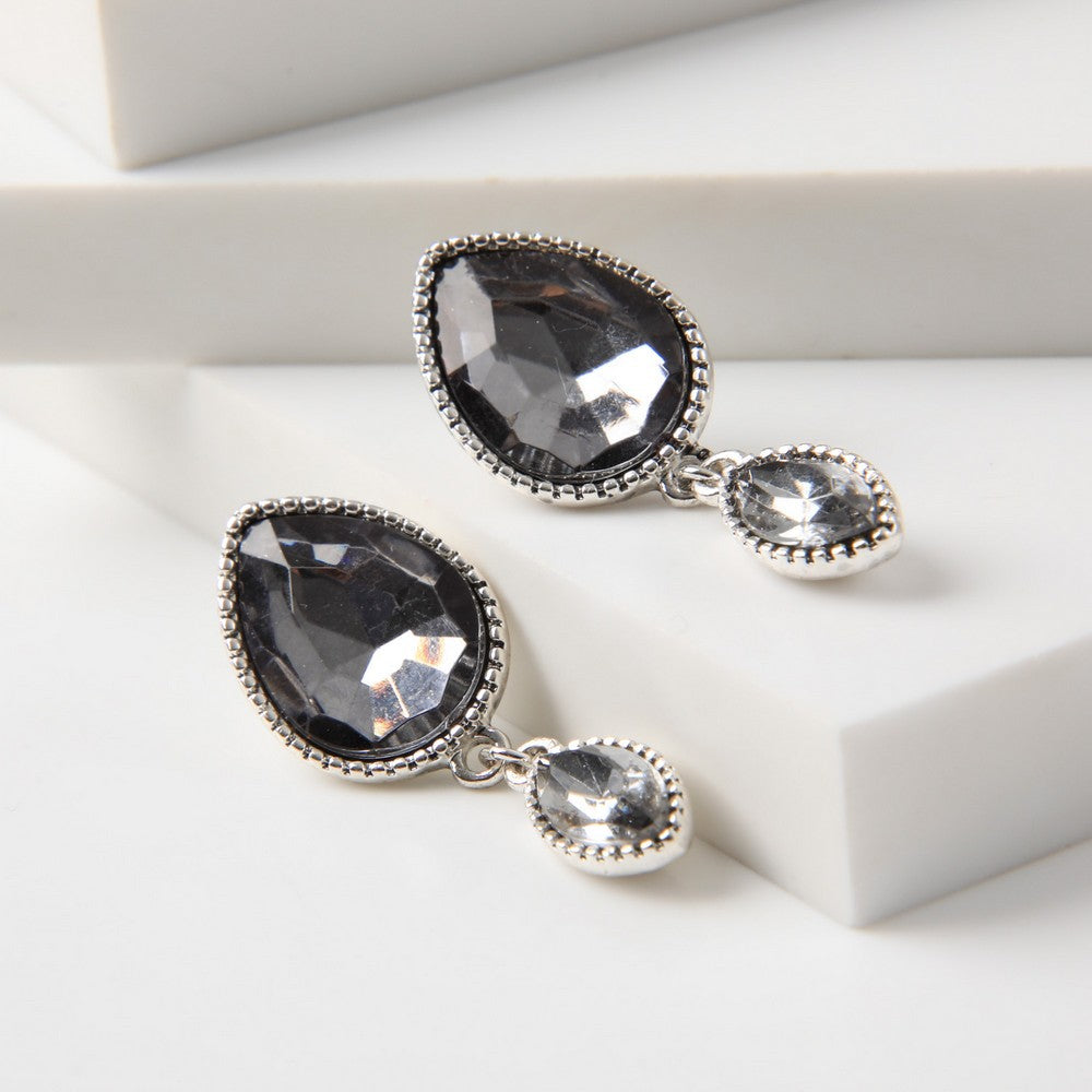 Aros plateados con tipo cristales facetados en tono gris humo, dispuestos en un diseño doble tipo gota. El marco con detalles texturizados realza el brillo del cristal y aporta un look elegante y sofisticado. Ideales para ocasiones especiales o para elevar un outfit más simple, son un accesorio protagonista, femenino y fácil de combinar.
