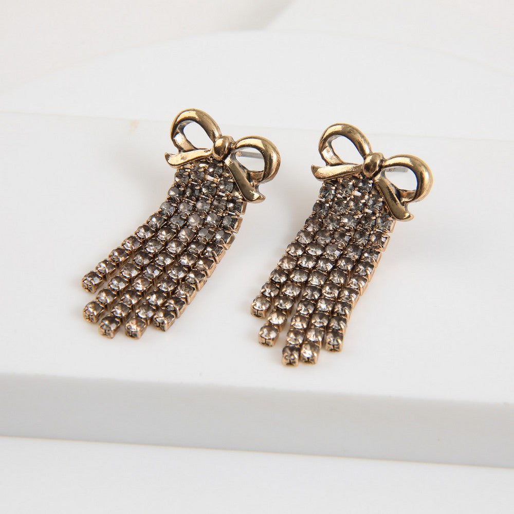 Aros dorados de diseño femenino y brillante con un lazo metálico dorado en la parte superior y una cascada flexible de aplicaciones tipo cristal en tono gris humo, que aporta movimiento y un toque festivo. Son una opción ideal para complementar looks de invierno con un acabado elegante y luminoso.