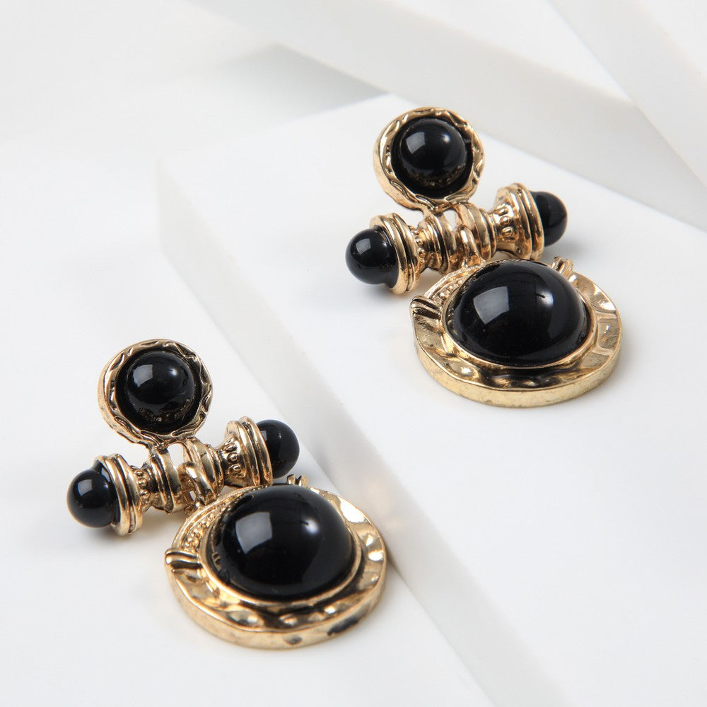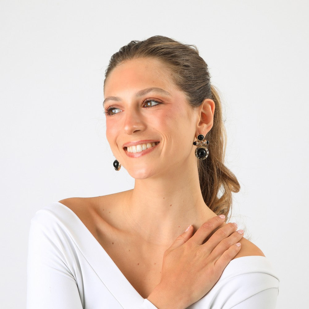 Aros dorados con detalles en relieve y piezas redondas en color negro con brillo tipo cristal, que aportan un aire elegante y algo vintage. Son ideales para levantar un look sencillo o complementar un outfit más arreglado, sumando personalidad sin perder versatilidad. Un accesorio práctico y fácil de combinar.