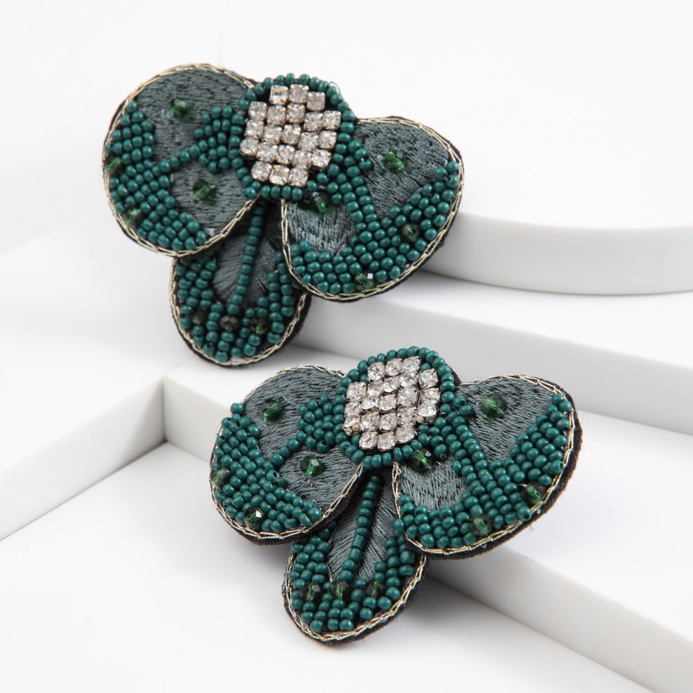 Aro pegado en forma de flor con mostacillas verdes, hilos del mismo tono y brillantes de fantasía.