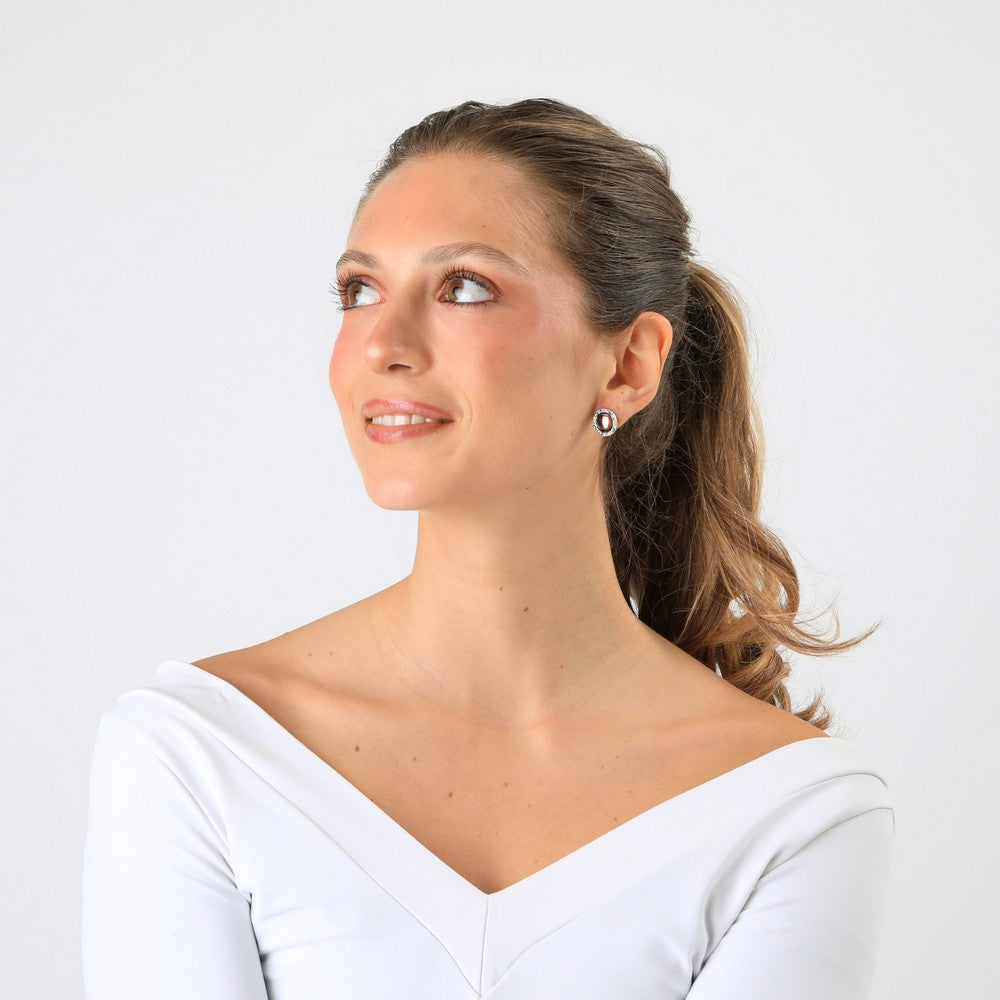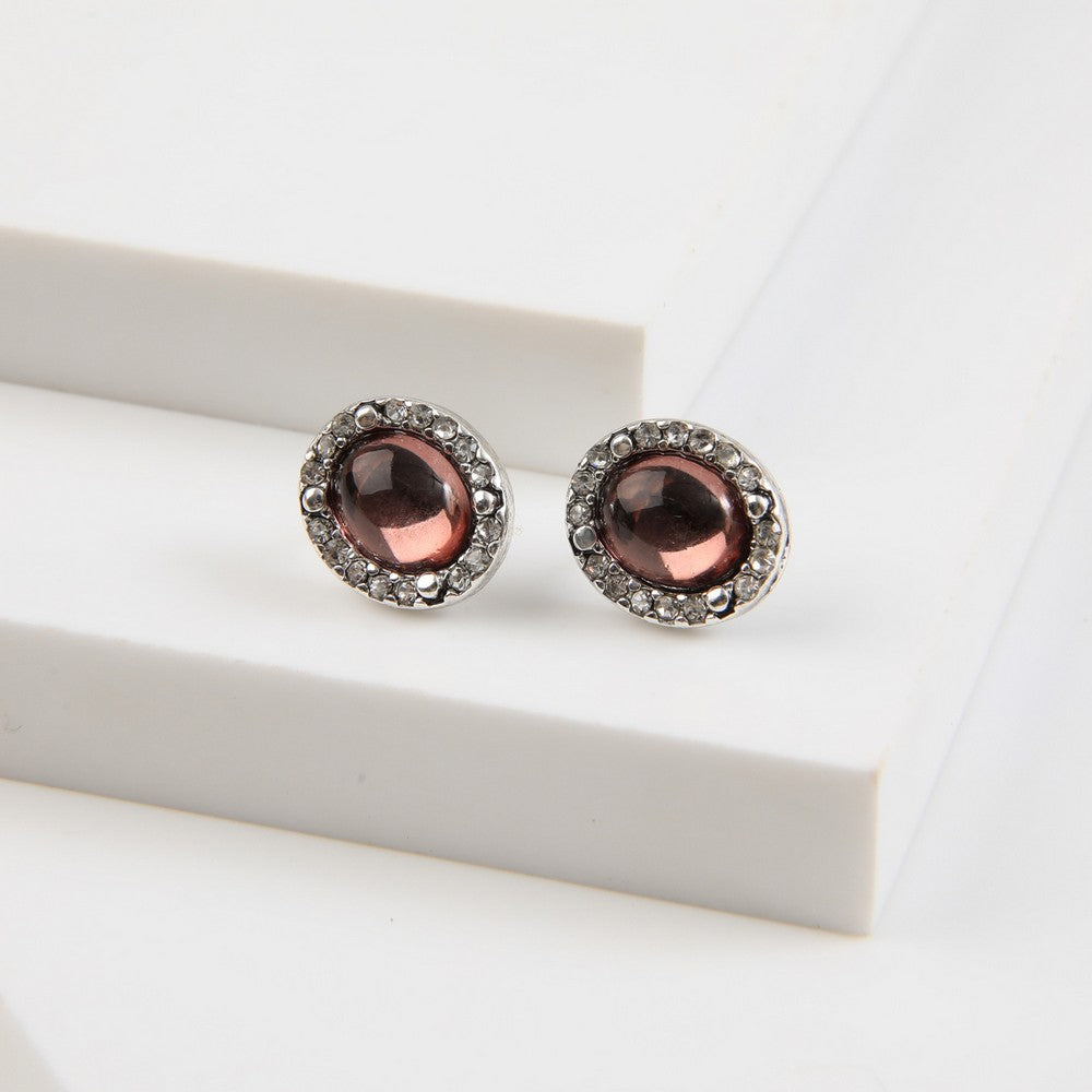 Aros pequeños en tono plateado con un centro abombado en color burdeo tipo cristal, rodeado por un borde de brillos que aporta un acabado delicado y elegante. Su tamaño compacto los hace ideales para el día a día, pero con el toque justo de luz para complementar looks de invierno, abrigos en tonos neutros o outfits más clásicos. Un accesorio versátil y femenino para sumar un detalle sofisticado.