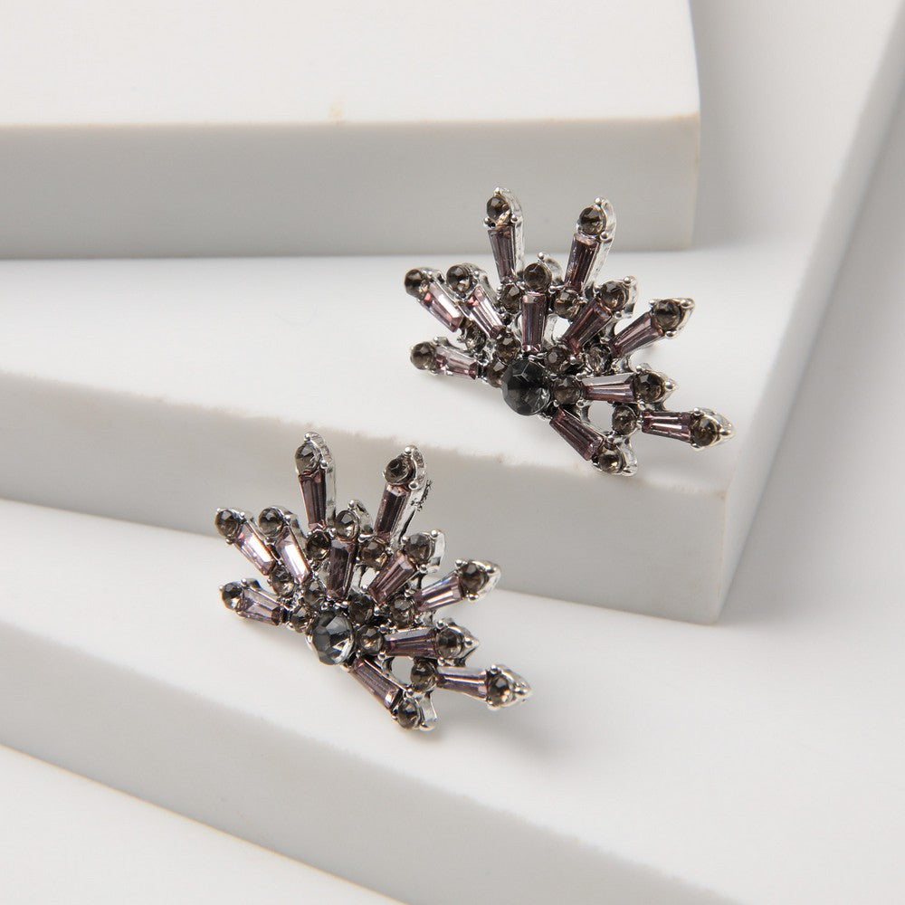 Aros pegados estilo statement en plateado, con diseño de abanico compuesto por múltiples tipo cristales alargados en tono morado oscuro. Un accesorio llamativo y elegante para ocasiones especiales.