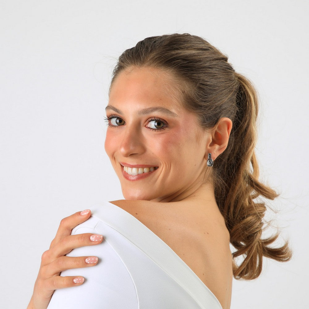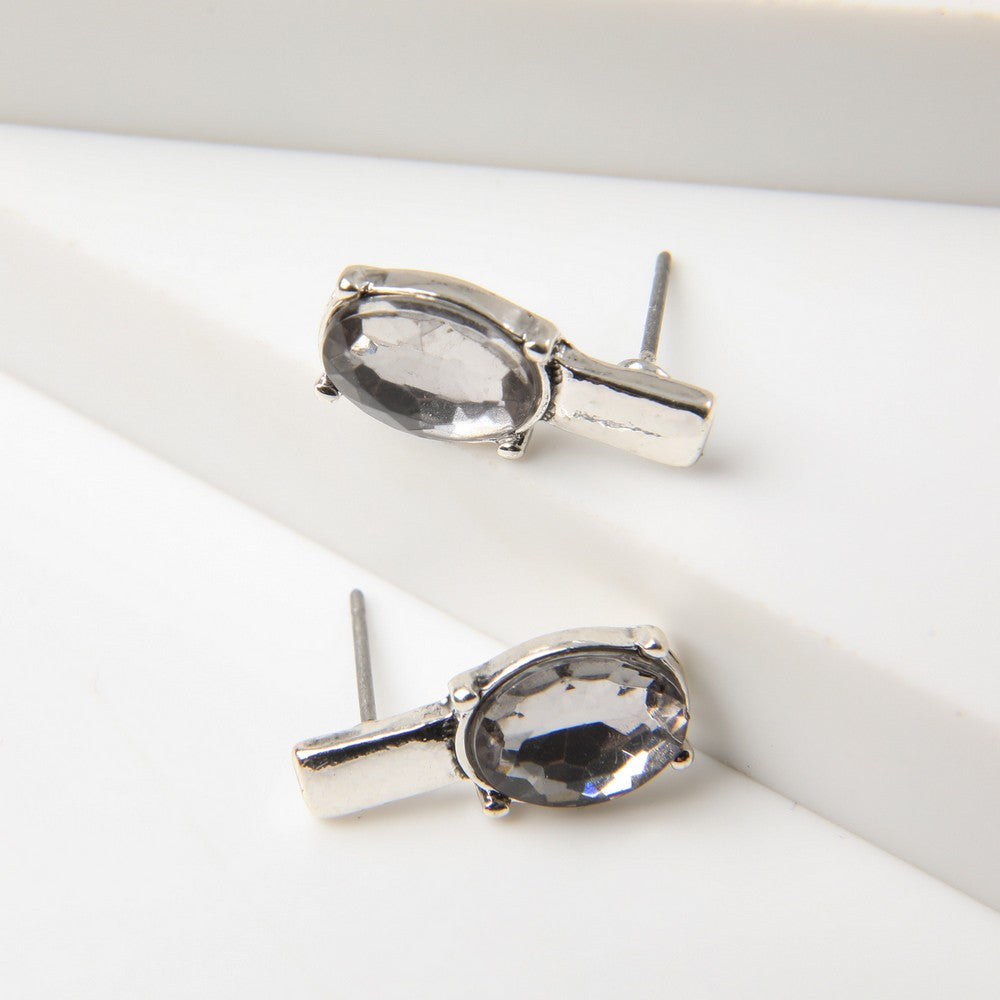 Aros de tamaño pequeño con colgante ovalado tipo cristal transparente facetado, montado en base metálica de acabado plateado. Presentan un diseño delicado y luminoso, con fijación superior simple que aporta comodidad y buen ajuste. Ideales para uso diario o para sumar un toque sutil de brillo a looks más arreglados. Un accesorio liviano.