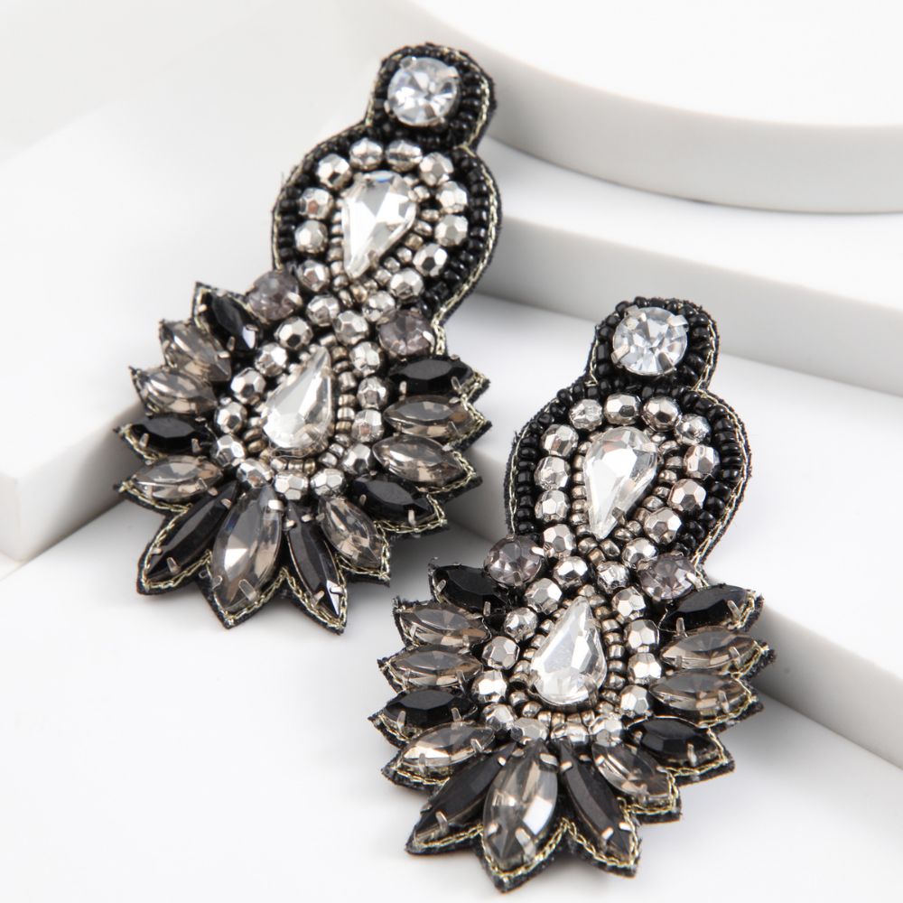 Aro largo en forma de flor con mostacillas negras, plateadas y piedras de fantasía en tonos grises.