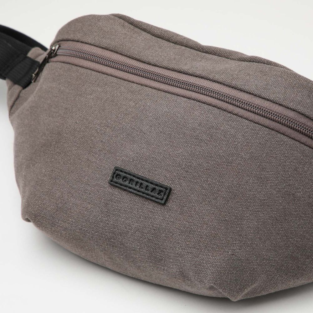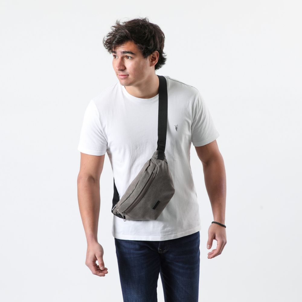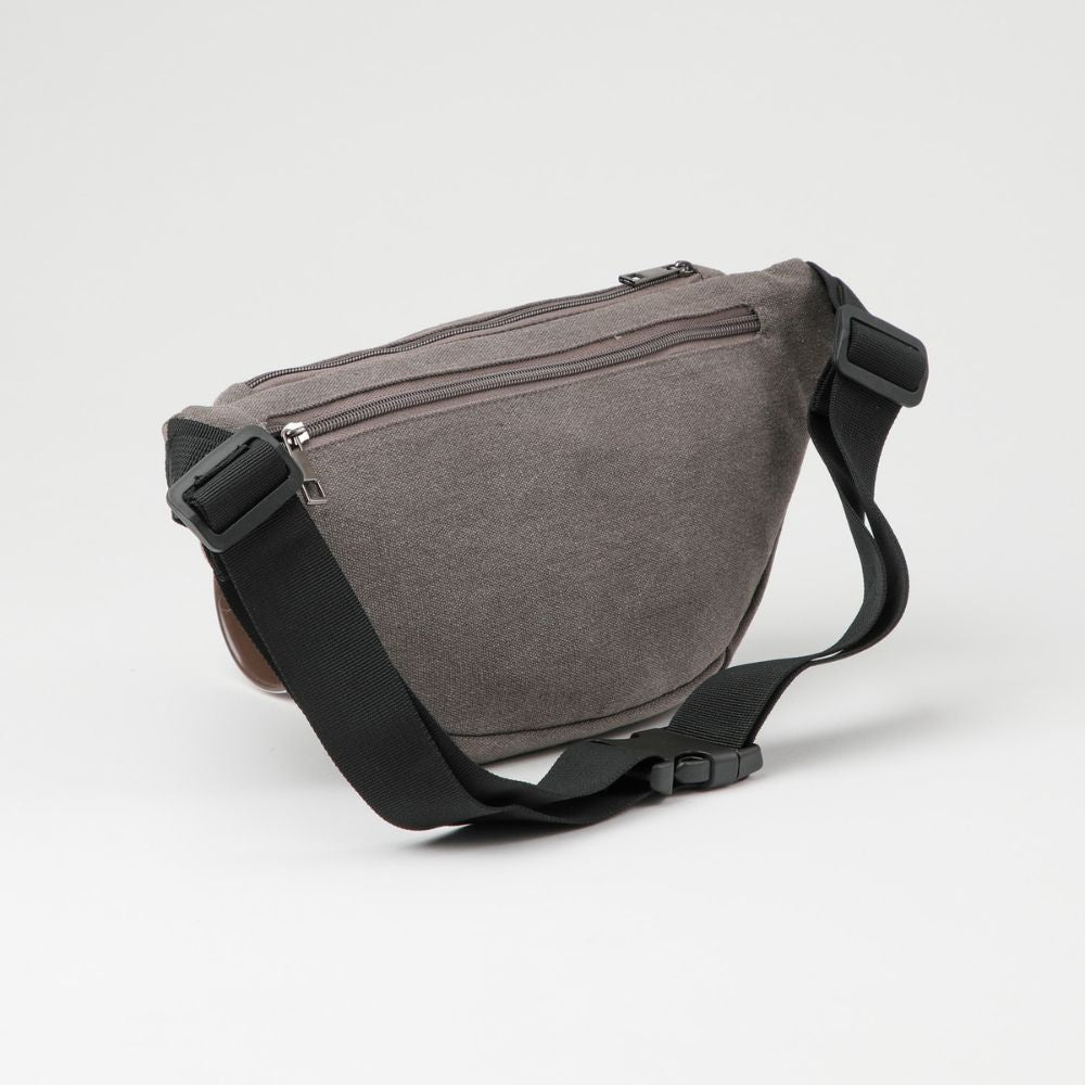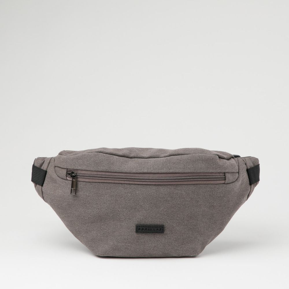 Banano de tela gris con cierre y correa de tela negra con broche y hebilla para ajustar el largo. Lleva un bolsillo con cierre por el frente y dos bolsillos abiertos por el interior.