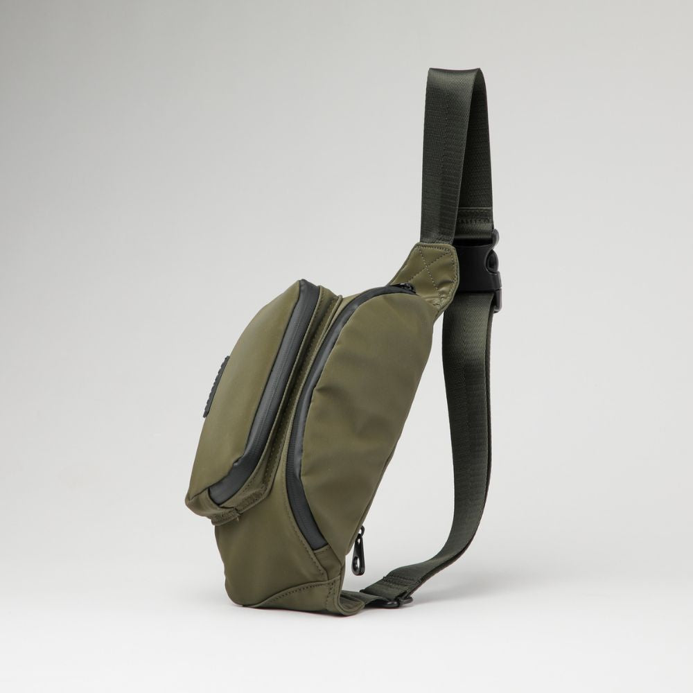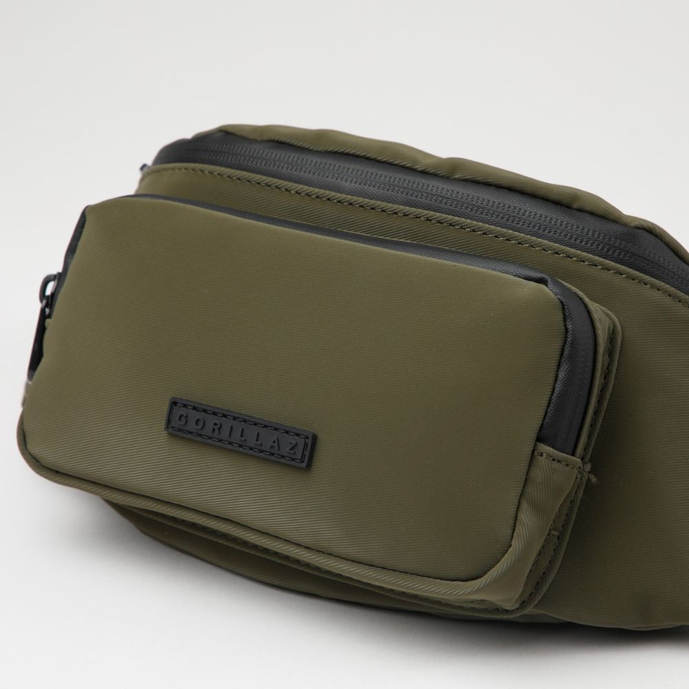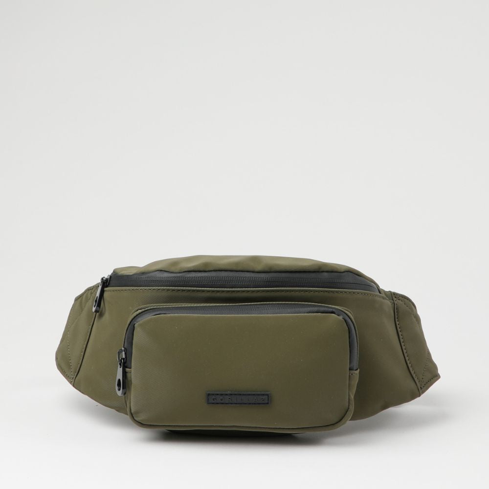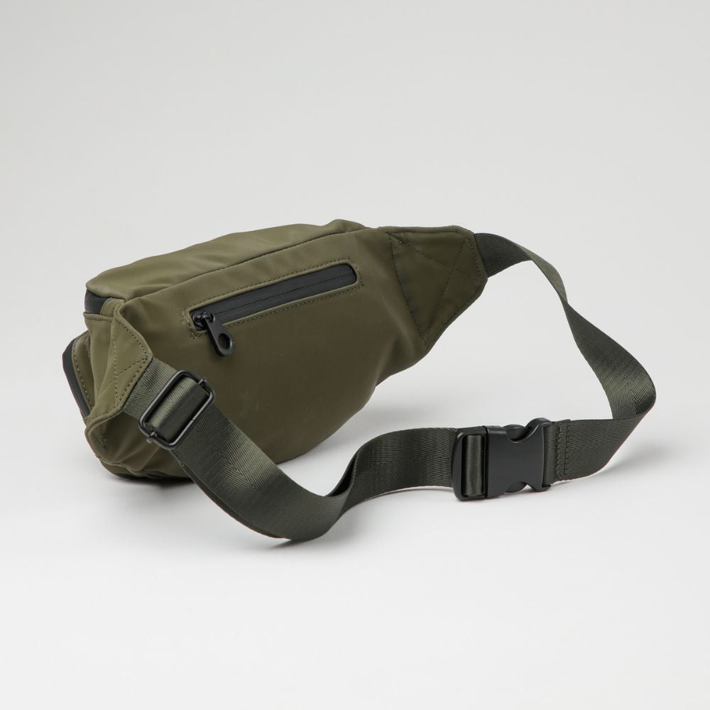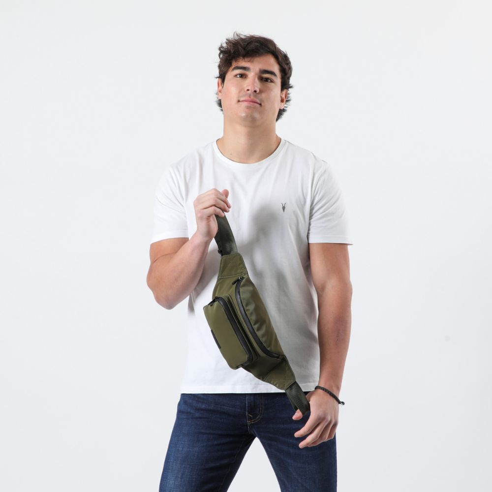 Banano de nylon verde con cierre y correa de tela con broche y hebilla para ajustar el largo. Lleva un bolsillo con cierre por el frente y otro en el interior. Los cierres, broche, hebilla y logo son negros.