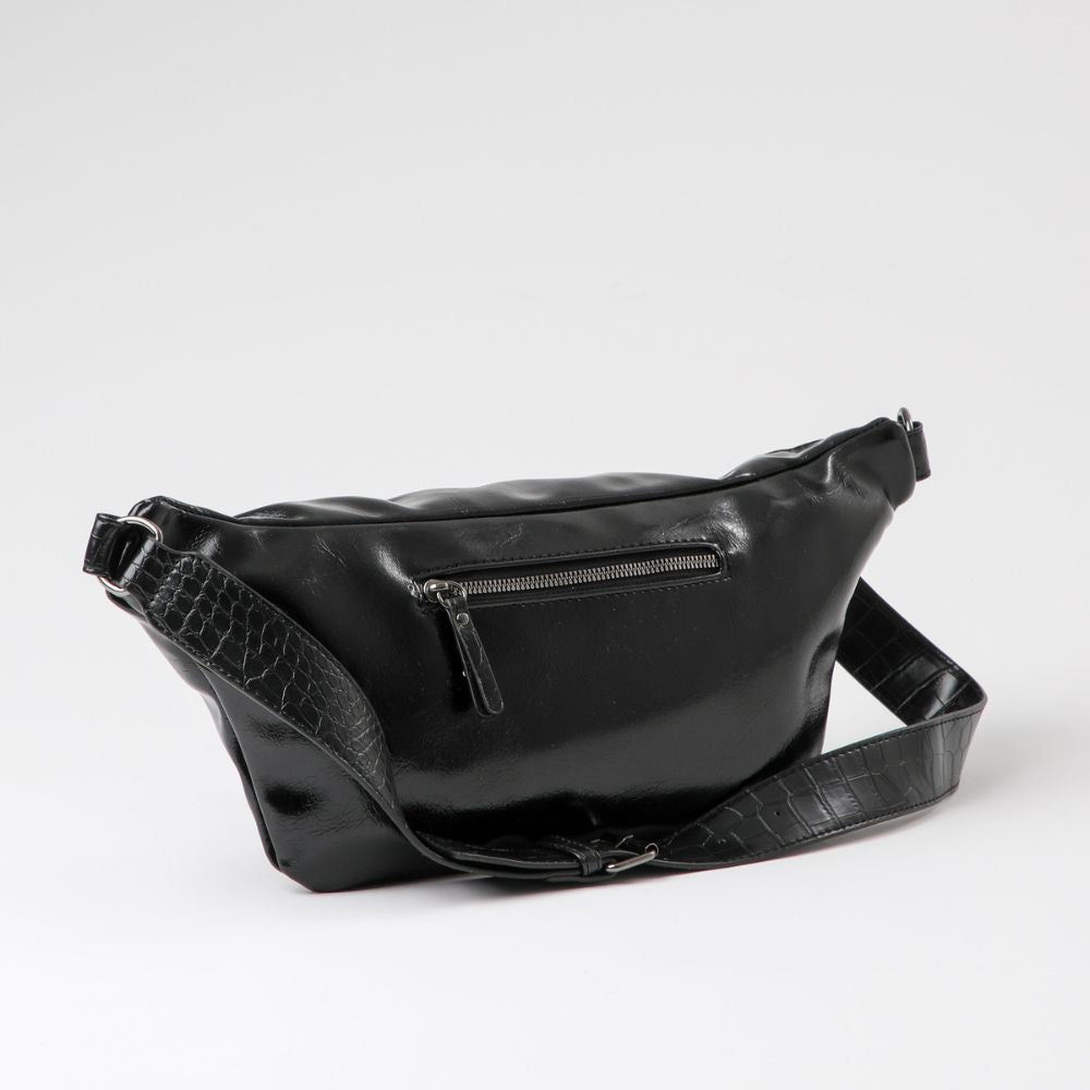 Es un banano de ecocuero acharolado negro simple, con una parte y la correa ajustable de textura croco. Cuenta con un bolsillo principal con cierre, dos bolsillos exteriores con cierre, uno en la parte delantera y el otro en la trasera. En su interior también tiene un bolsillo más pequeño con cierre y otro bolsillo abierto organizador. Los cierres, hebilla y logo exterior son de metal plateado oscuro.