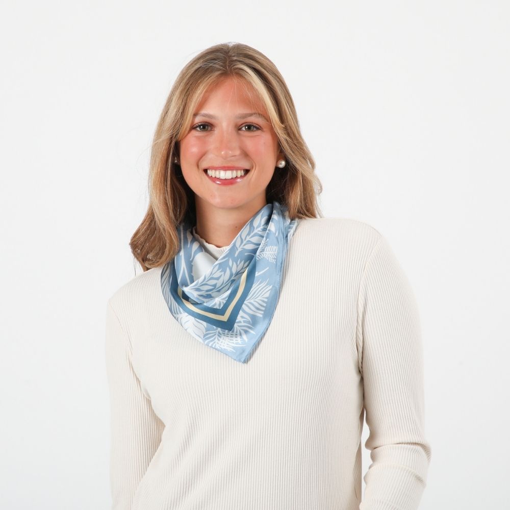 Bandana Cuadrada Celeste Floral Orgánico En Tonos Blancos Con Marco En Tono Azul Y Amarillo. Terminación Costura Simple.