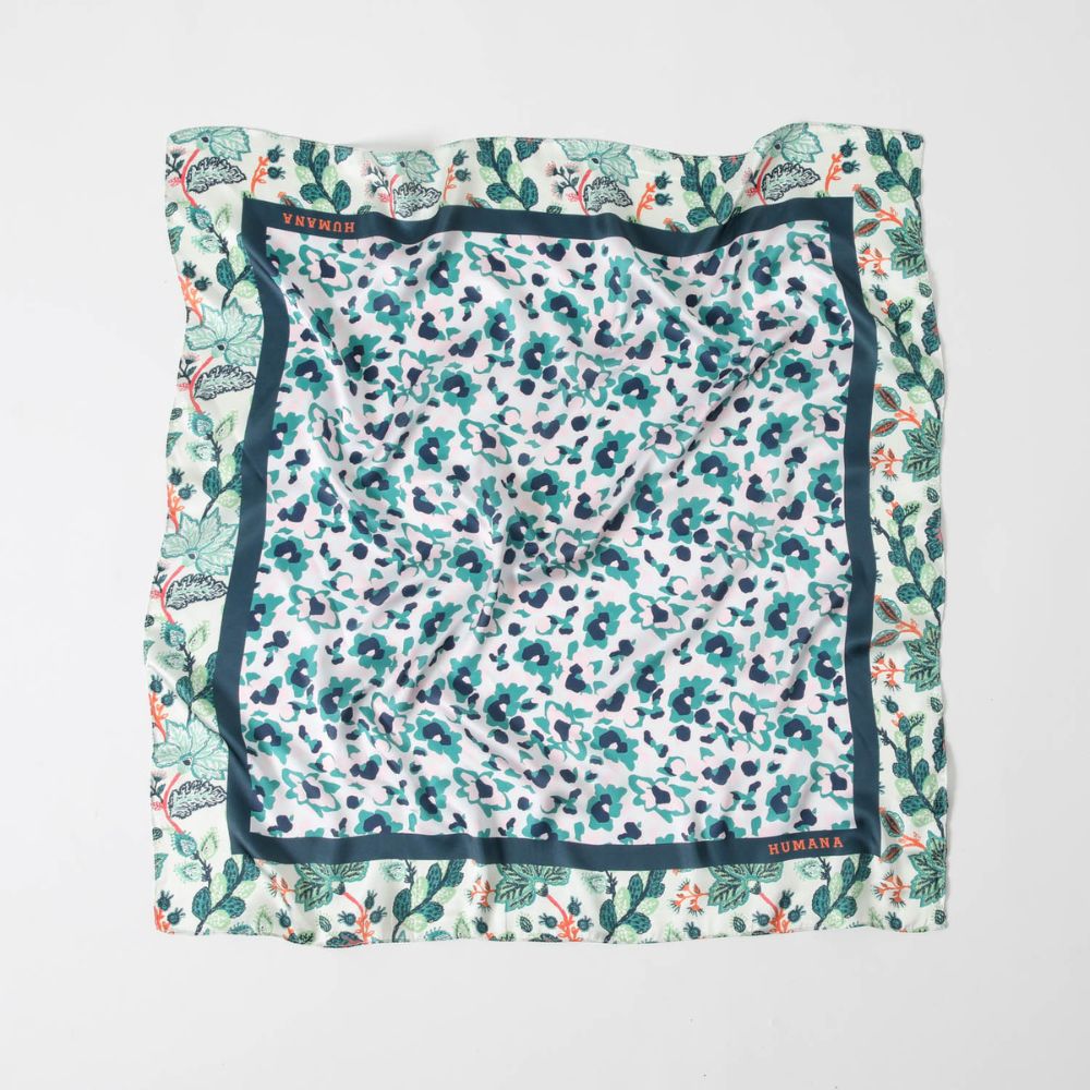 Bandana verde estampada con motivos florales rosados y verdes sobre un fondo blanco con un marco que separa un estampado con motivos florales verdes con naranjo.