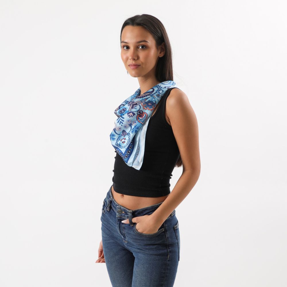 Bandana estampada con motivos rococo abstracto tipo mosaico de color azul y naranjo sobre un fondo celeste con un marco con estampados pequeños en los mismos tonos.