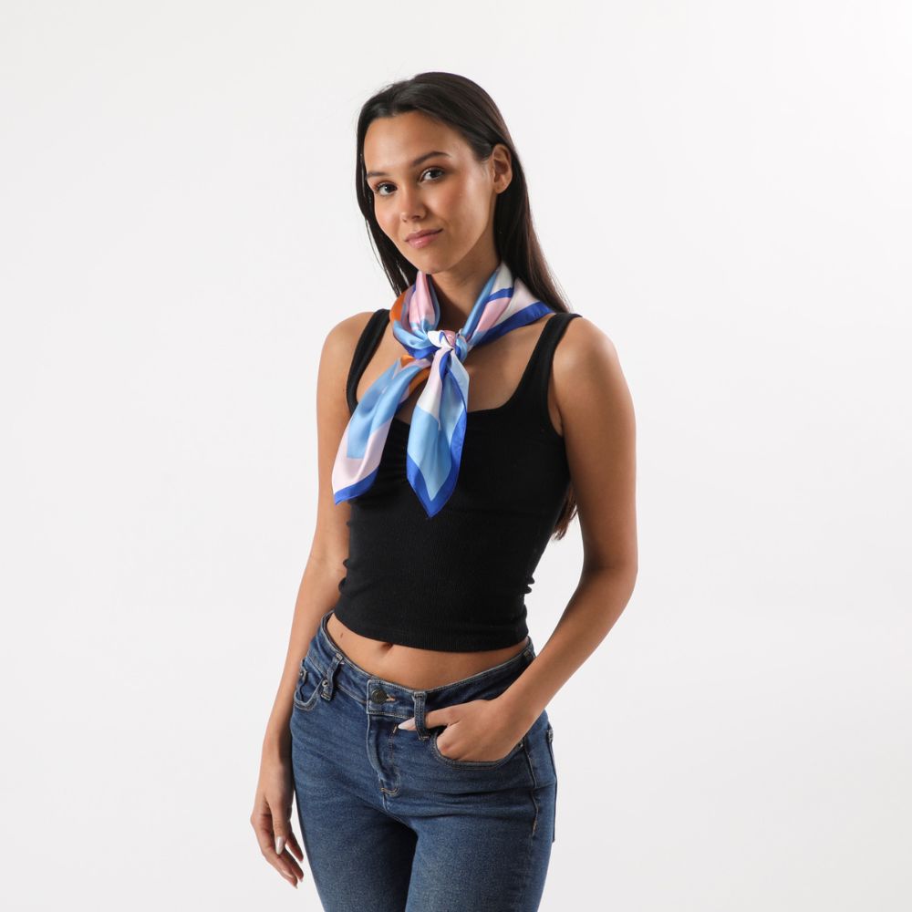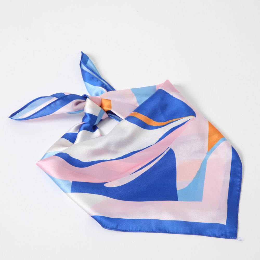 Bandana azul estampada con motivos abstractos de colores rosado, naranjo, celeste, blanco y azul, con un marco azul en sus extremos.