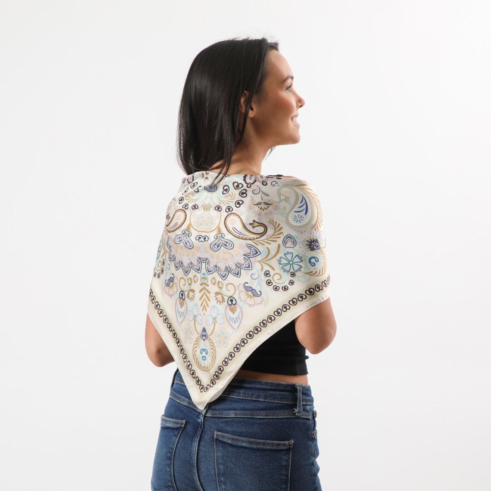 Bandana estampada con motivos de rococo abstracto de colores pasteles sobre un fondo beige con un marco beige más oscuro con motivos rococo café y verde.