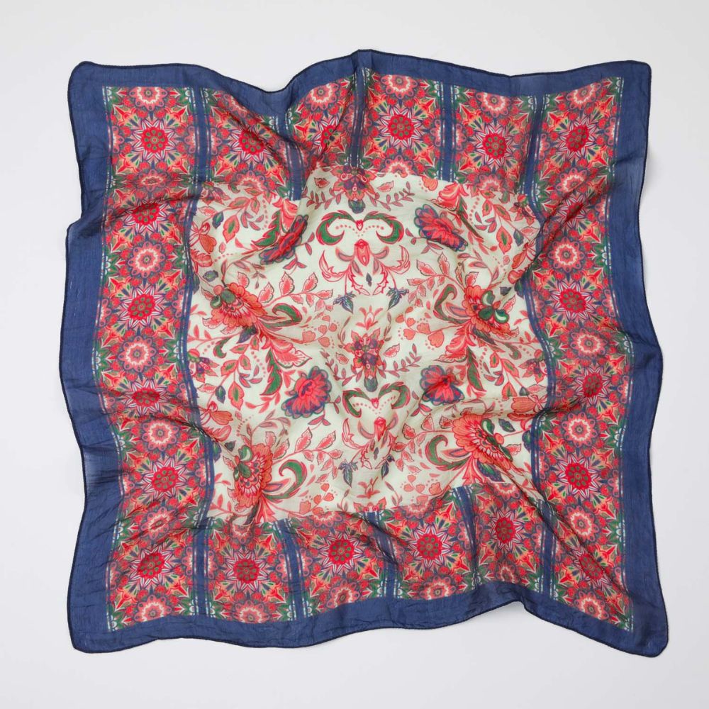 Bandana de seda rosada estampada con motivos florales con un marco en los bordes del pañuelo de color azul con terminaciones de costura lisa.