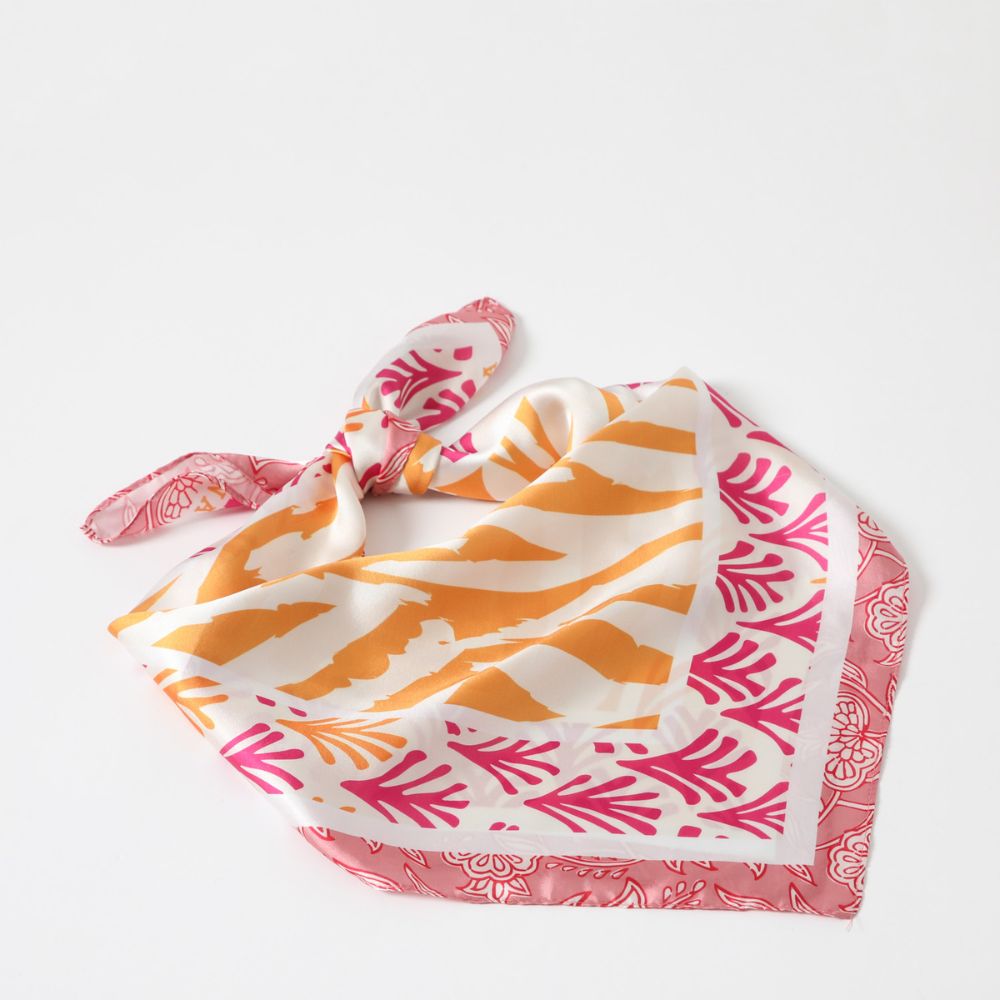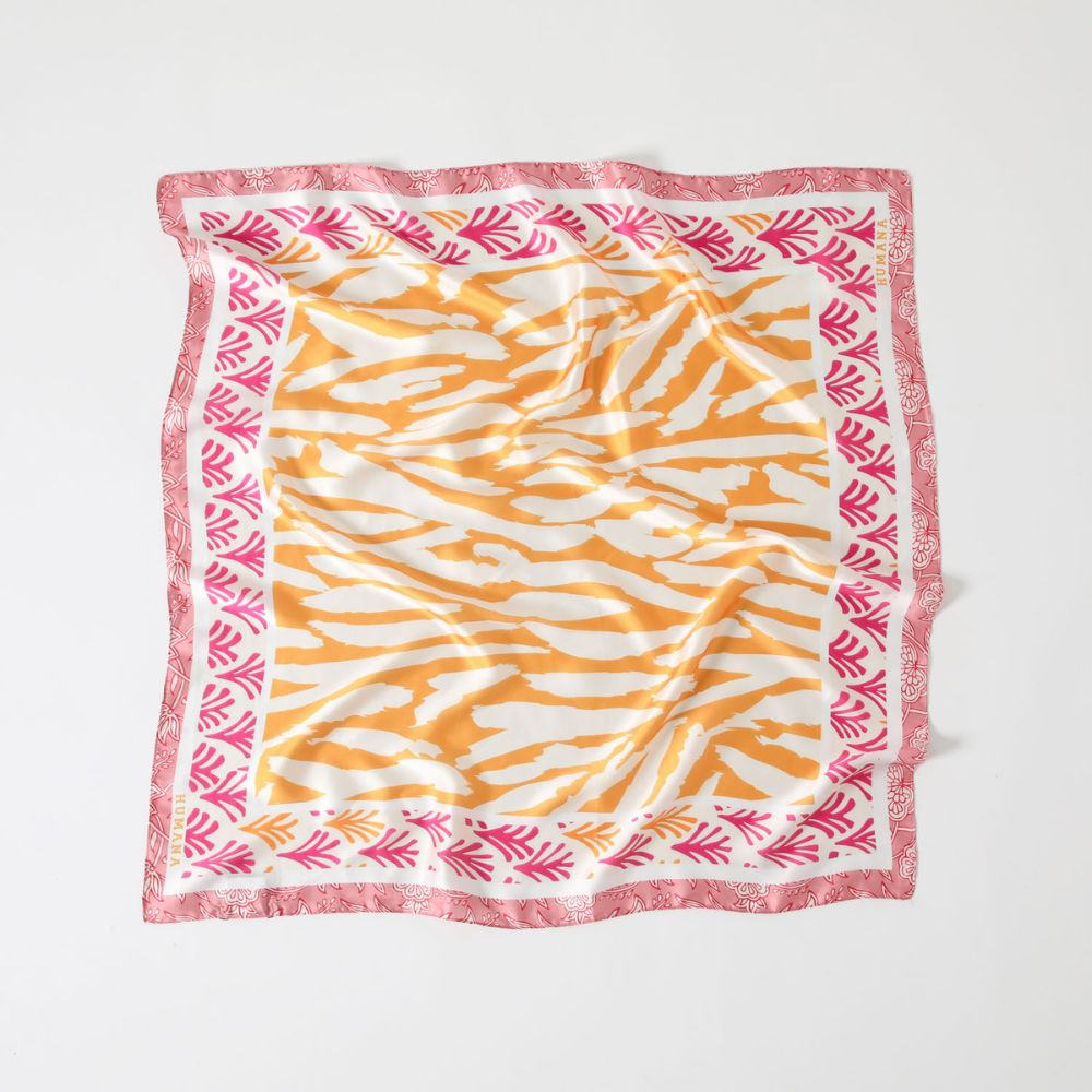 Bandana estampada con motivo de cebra beige sobre un fondo blanco con un marco de ramas abstractas rosadas y bordes estampados con motivos florales rosados y rojos.
