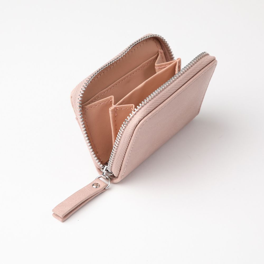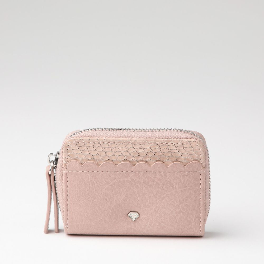Billetera chica ecocuero rosado y estampado serpiente rosado con dorado. Apertura tipo acordeon con capacidad para 2 tarjetas.