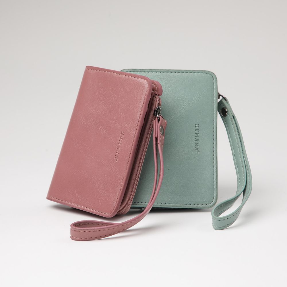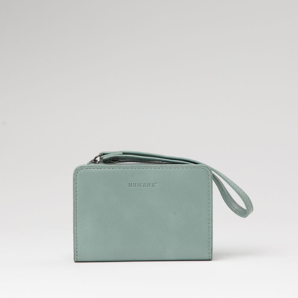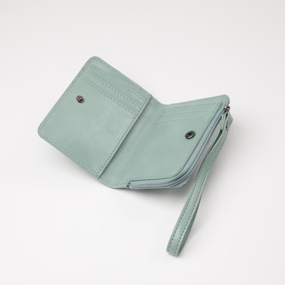 Billetera chica de ecocuero liso turquesa, con espacio para seis tarjetas y un bolsillo con cierre para efectivo.