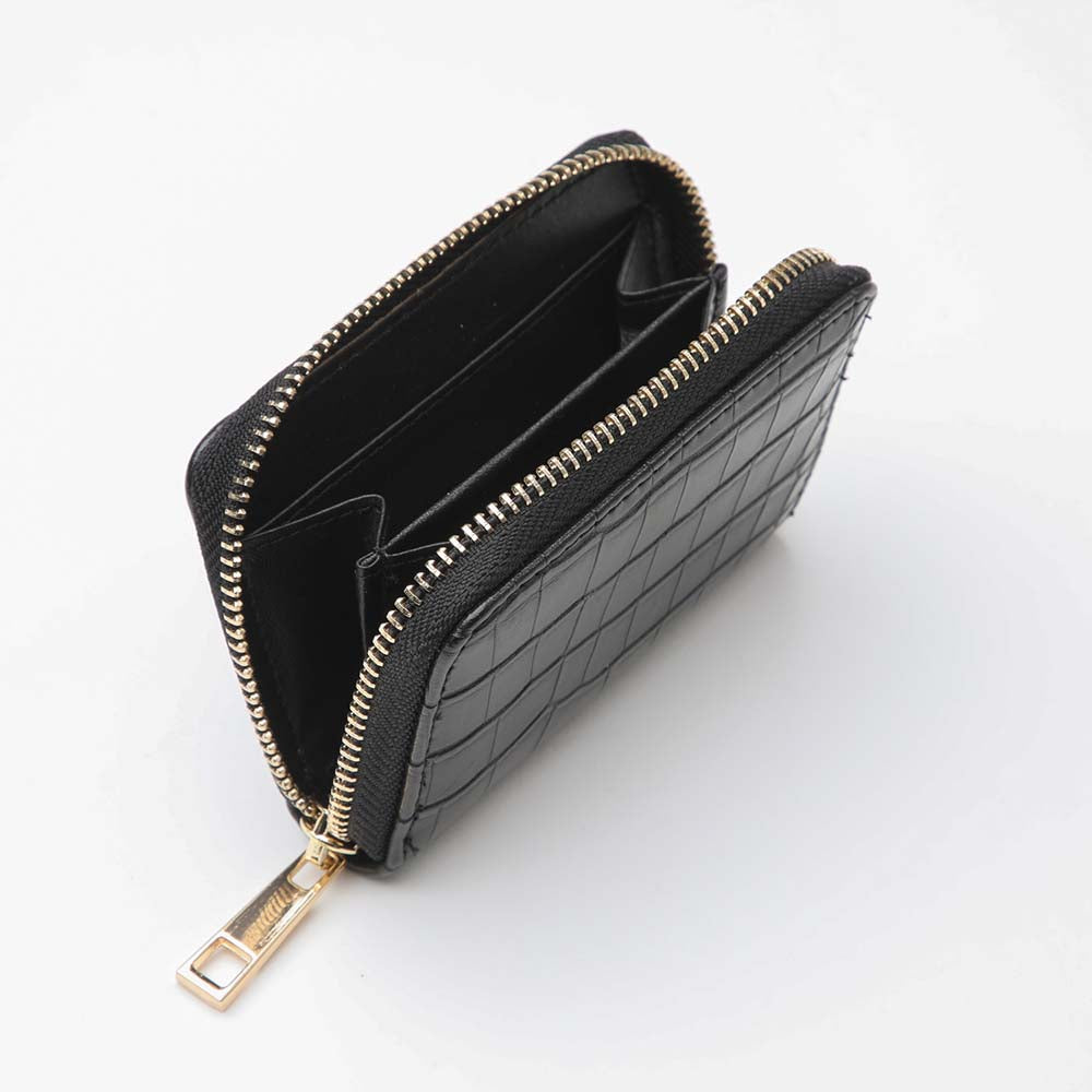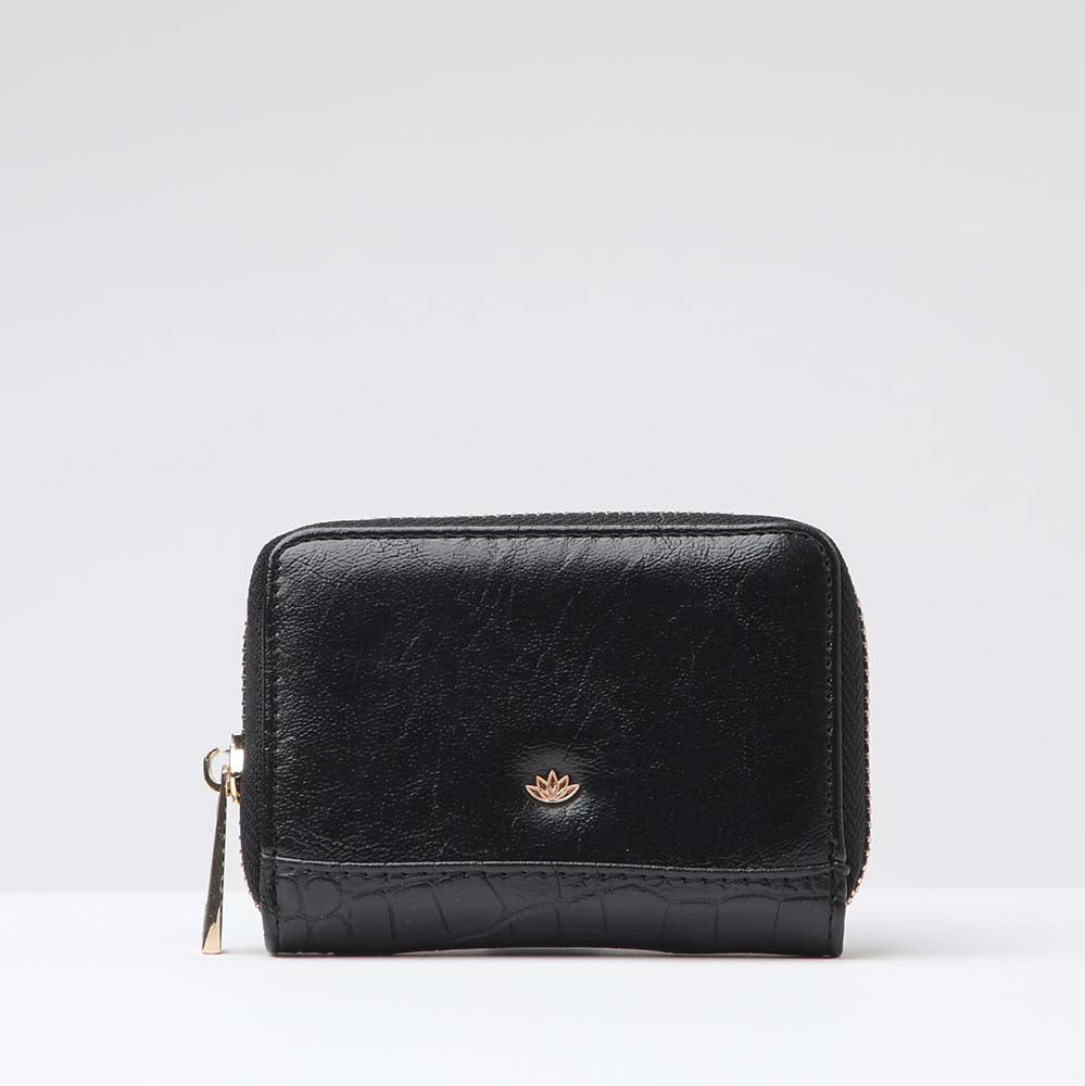 Billetera iD Diamond chica negra. Billetera de ecocuero con combinada con textura croco y liso. En su interior tiene bolsillos y variados compartimientos para guardar tarjetas o documentos.