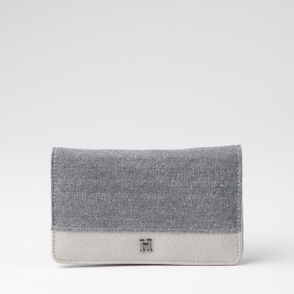 Billetera chica ecocuero gris y tela denim glitter. Capacidad para 9 tarjetas, monedero interno y 3 espacios anchos.