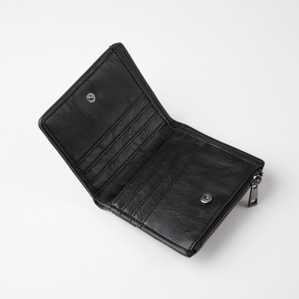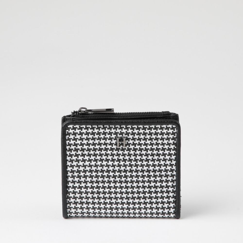 Billetera chica broche ecocuero blanco y negro. Capacidad para 8 tarjetas, espacio alargado y monedero con cierre.